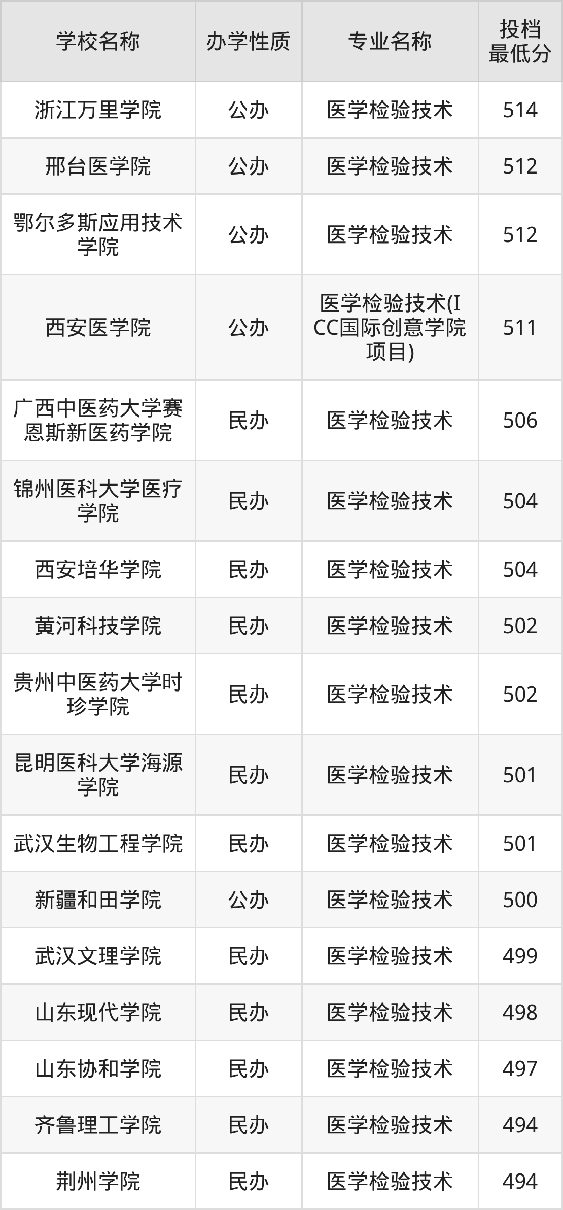 500分左右的医学检验技术大学:武汉生物工程学院501分、昆明医科大学海源学院501分、贵州中医药大学时珍学院502分、黄河科技学院502分、西安培华学院504分等;