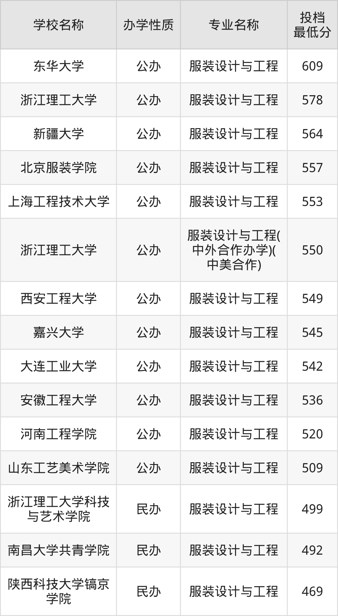 下面是2025年全国所有大学服装设计与工程专业录取分数线一览表(按照分数线从高到低排名):