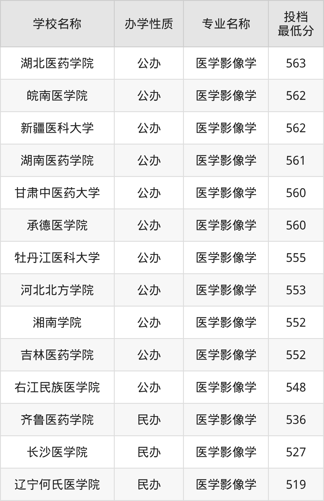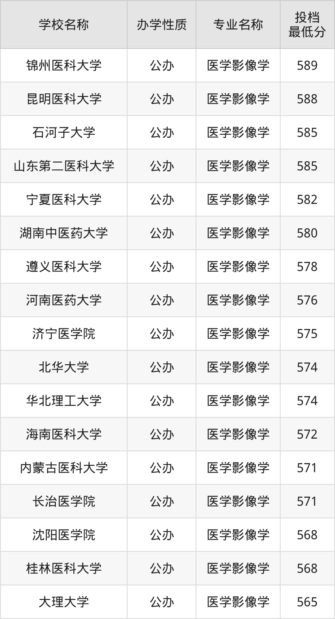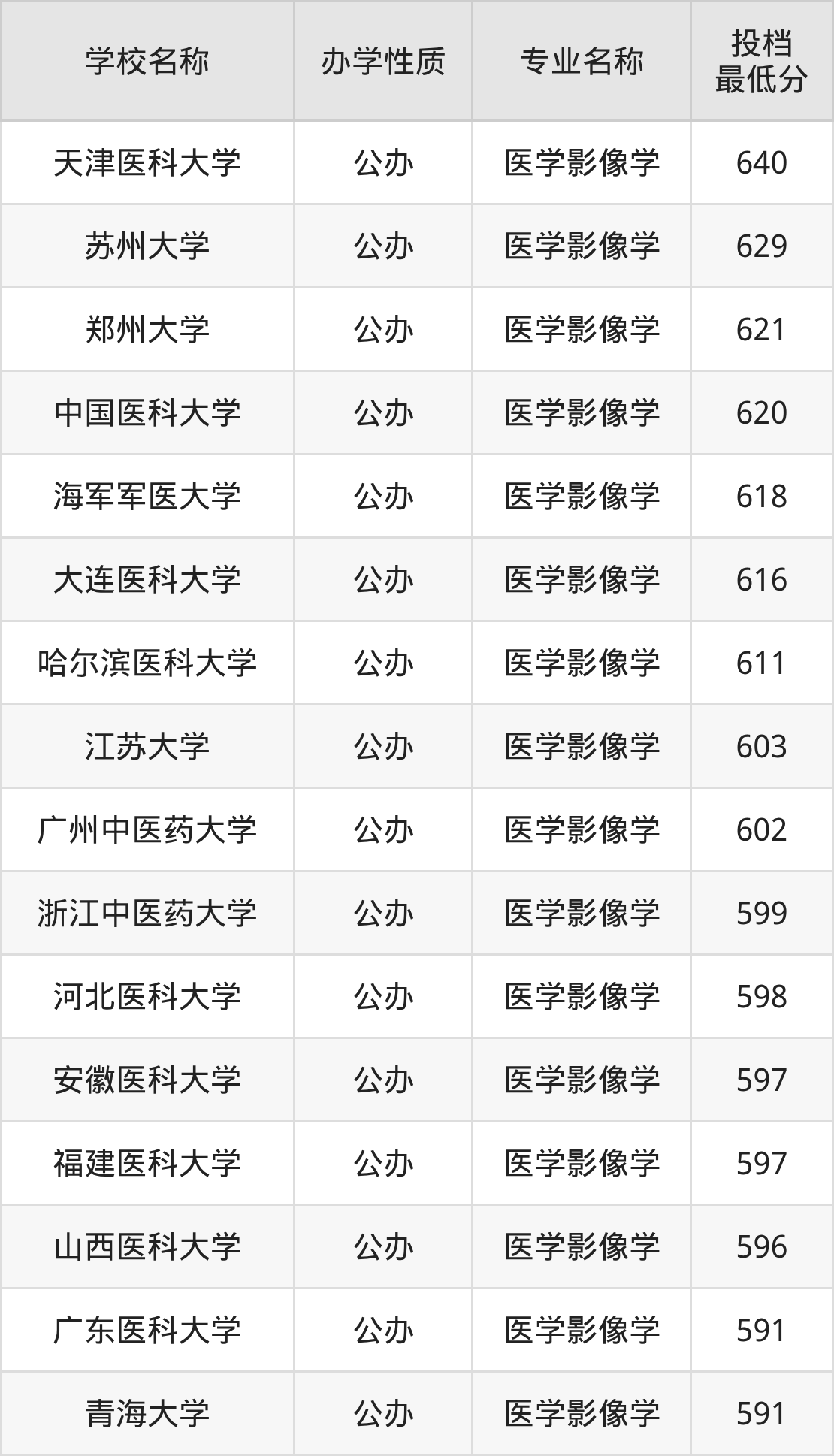 二、全国医学影像学录取分数线排名表