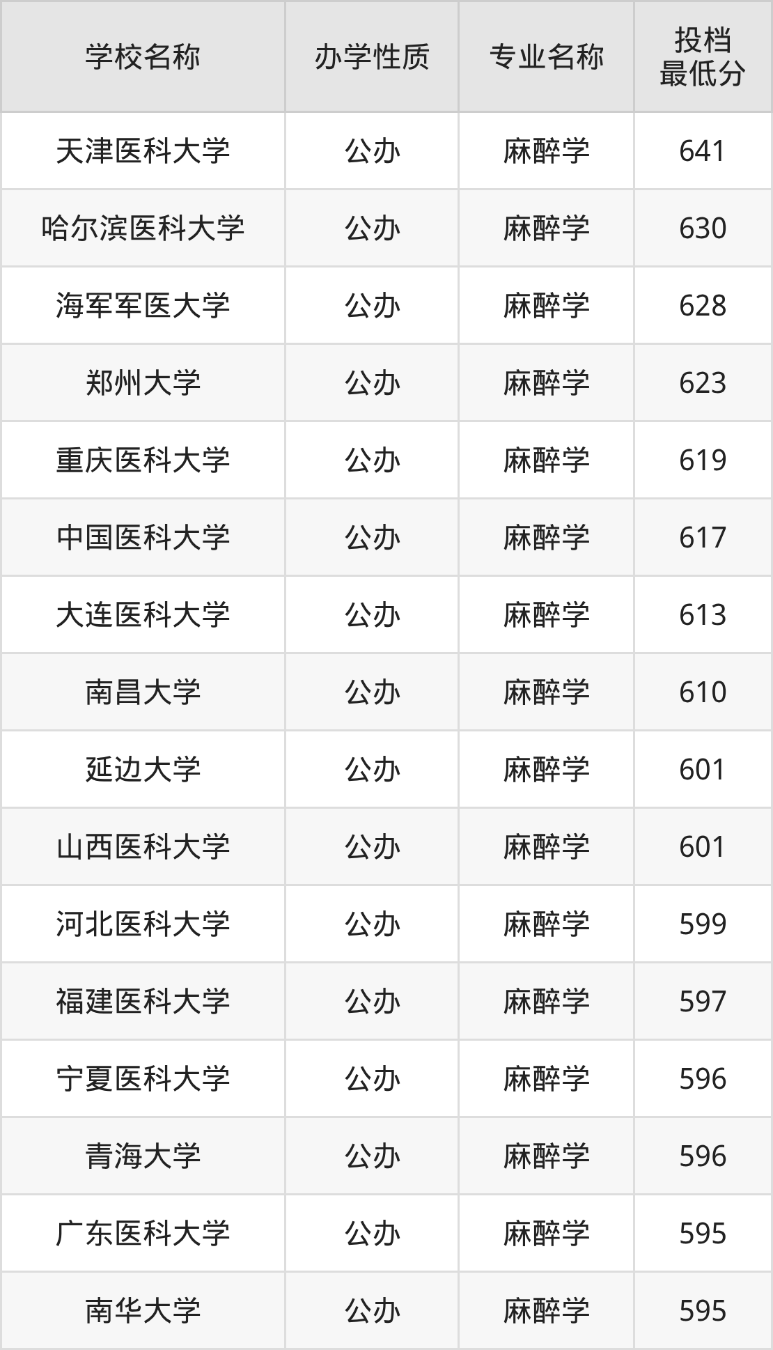 600分左右的麻醉学大学:山西医科大学601分、延边大学601分、南昌大学610分、大连医科大学613分、中国医科大学617分等;