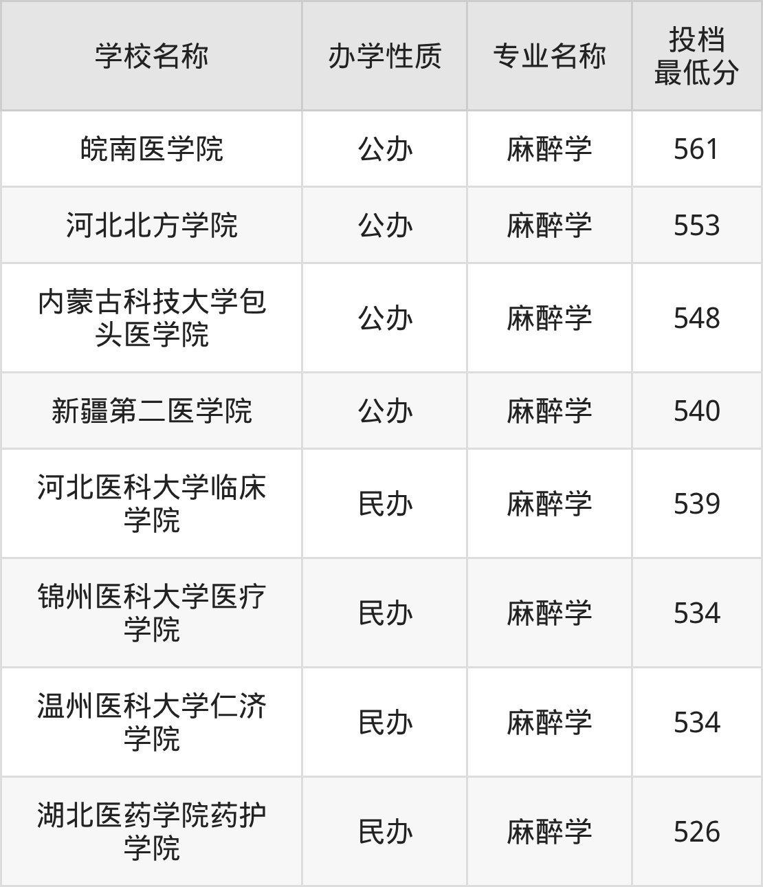 2025年麻醉学专业最低录取分数线是526分,超本科分数线(459分)67分。也就是说想报考麻醉学专业的同学,至少得超过本科线67分及以上。麻醉学专业最低分的大学是湖北医药学院药护学院,不过该校属于民办。