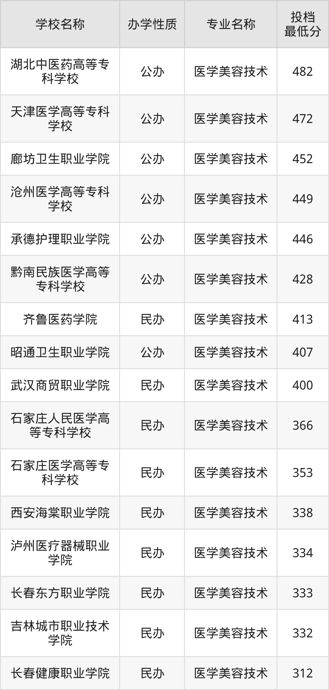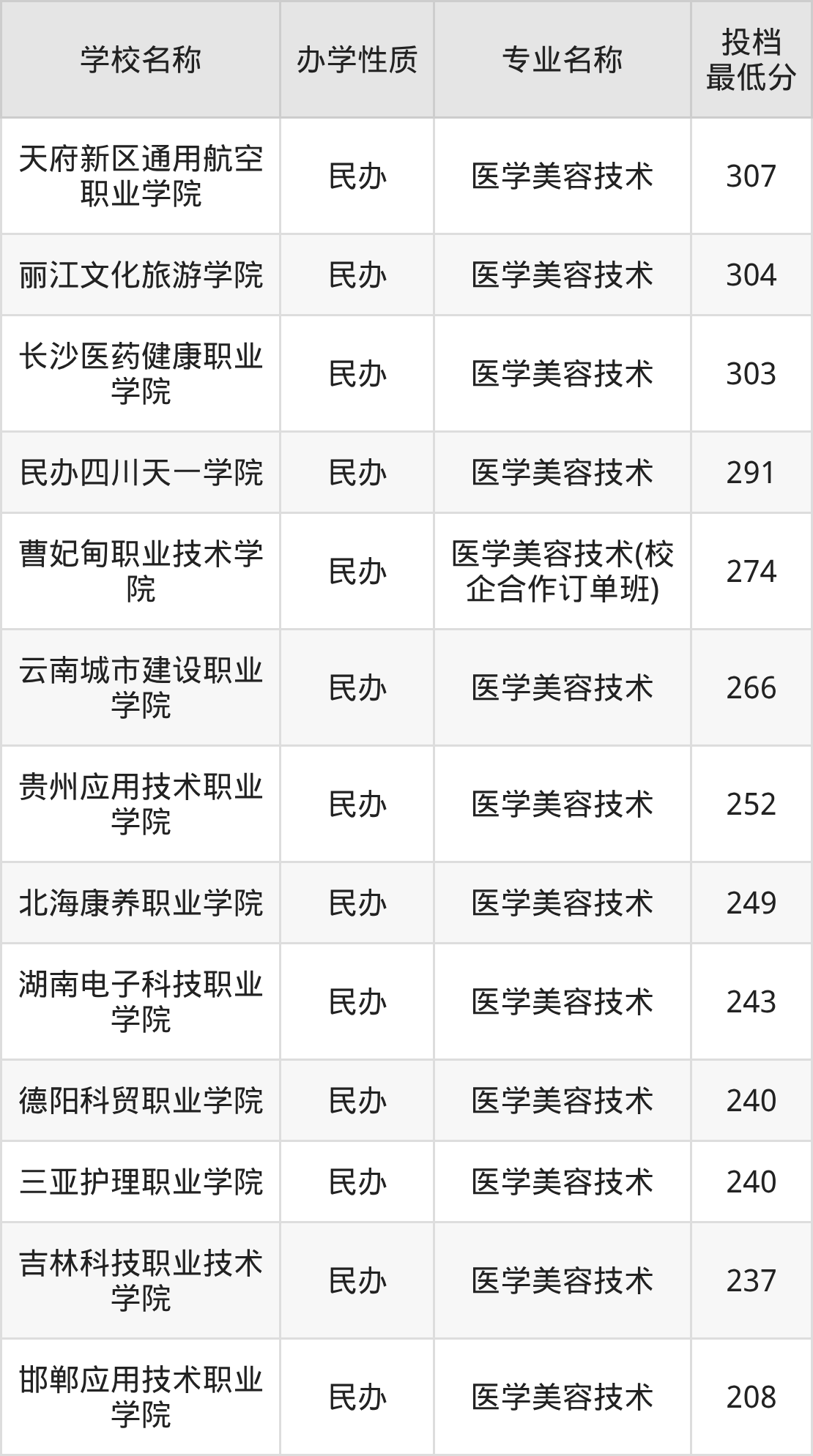 2025年医学美容技术专业最低录取分数线位于208分到482分之间,收分最低的大学是邯郸应用技术职业学院。各校最低分如下。