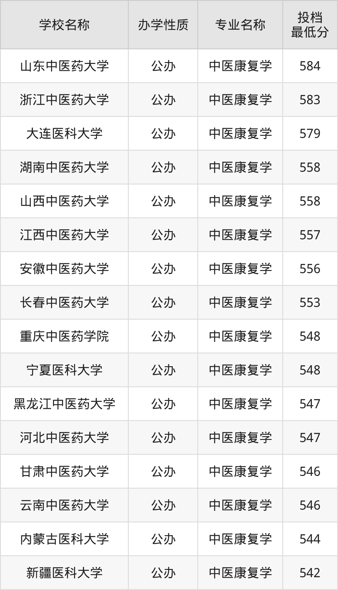 2025年全国中医康复学专业录取分数线从541分到584分不等,各校最低分数线存在较大差异。
