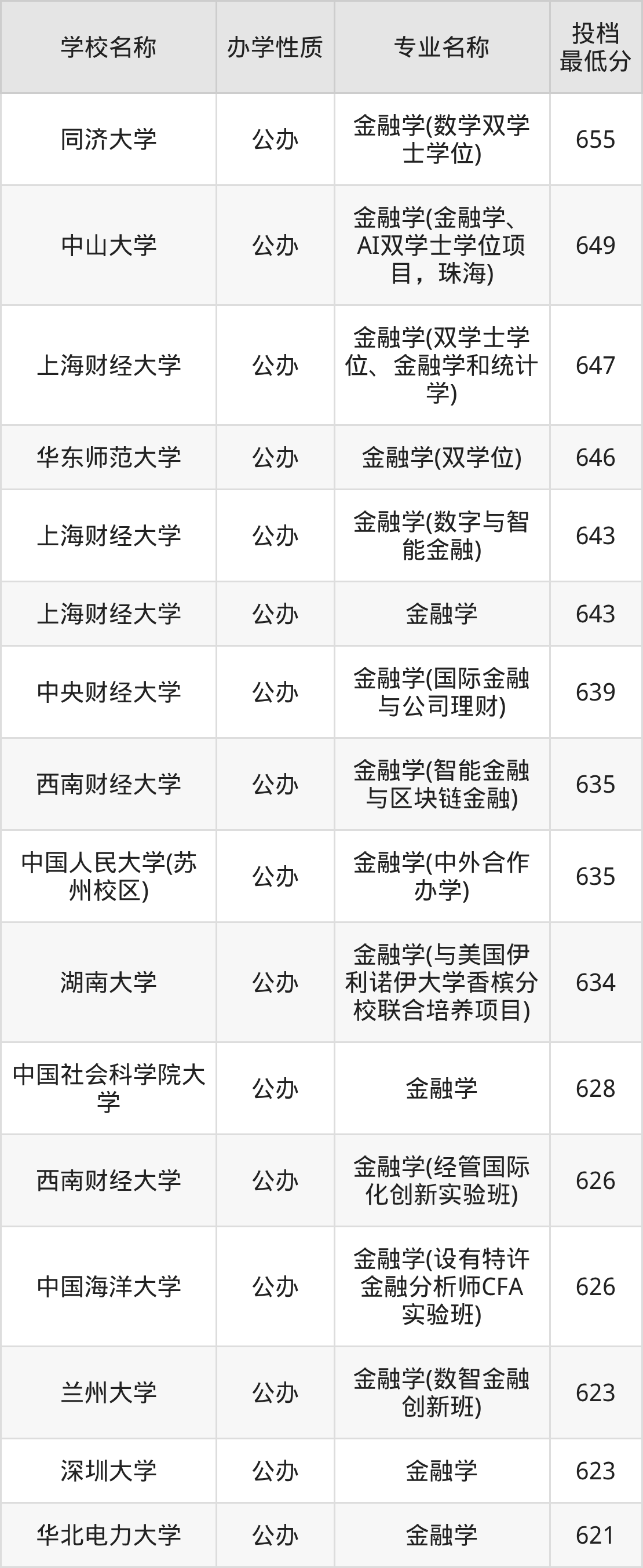 金融学专业收分最高的大学是同济大学(数学双学士学位),2025年最低分655分,超本科线196分。分数线排名前五的大学还有:中山大学(金融学、AI双学士学位项目,珠海)649分、上海财经大学(双学士学位、金融学和统计学)647分、华东师范大学(双学位)646分、上海财经大学(数字与智能金融)643分。