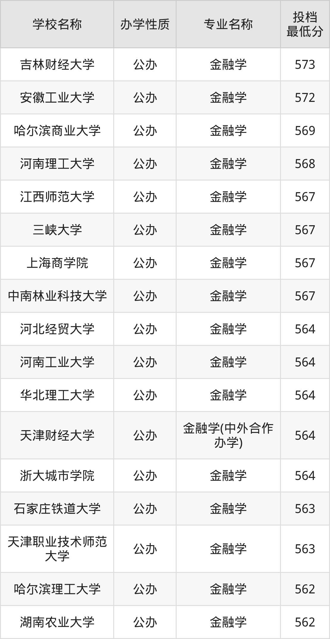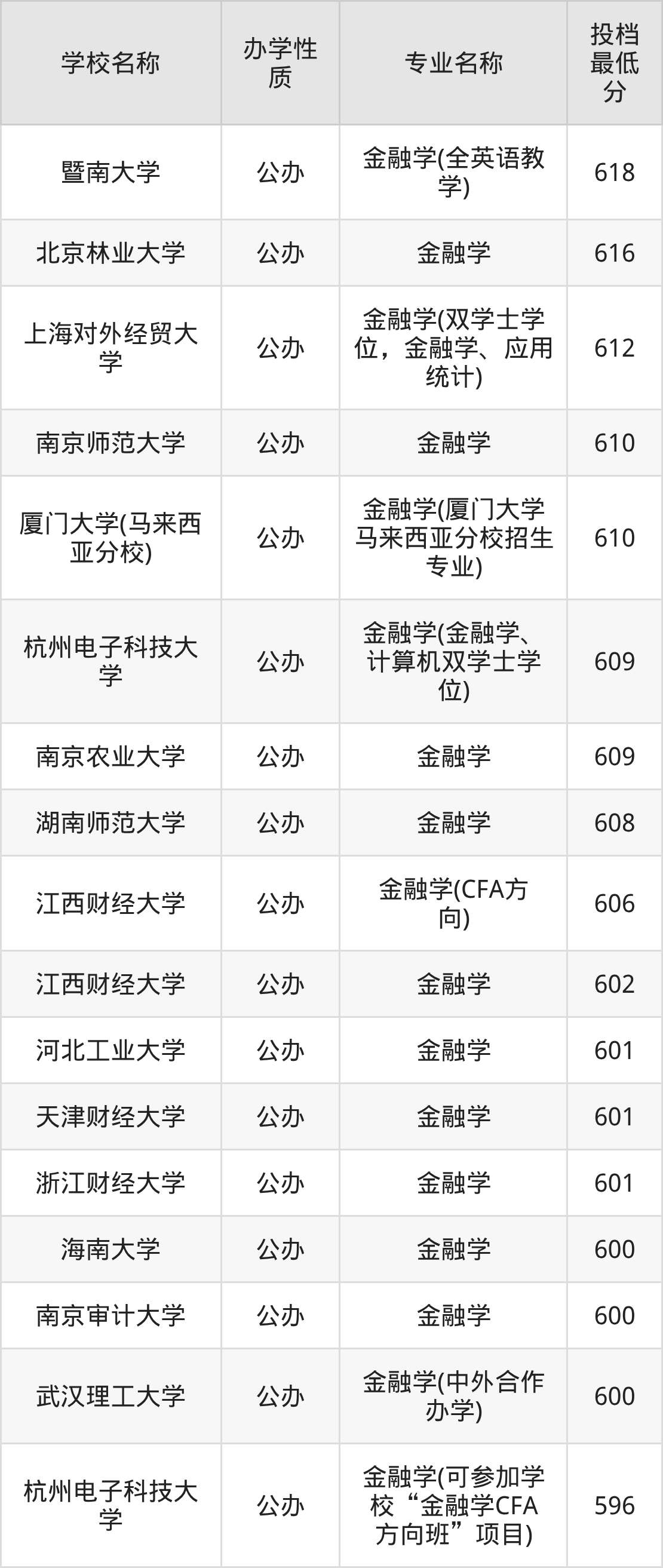 600分左右的金融学大学:浙江财经大学601分、天津财经大学601分、河北工业大学601分、江西财经大学602分、江西财经大学606分(CFA方向)等;