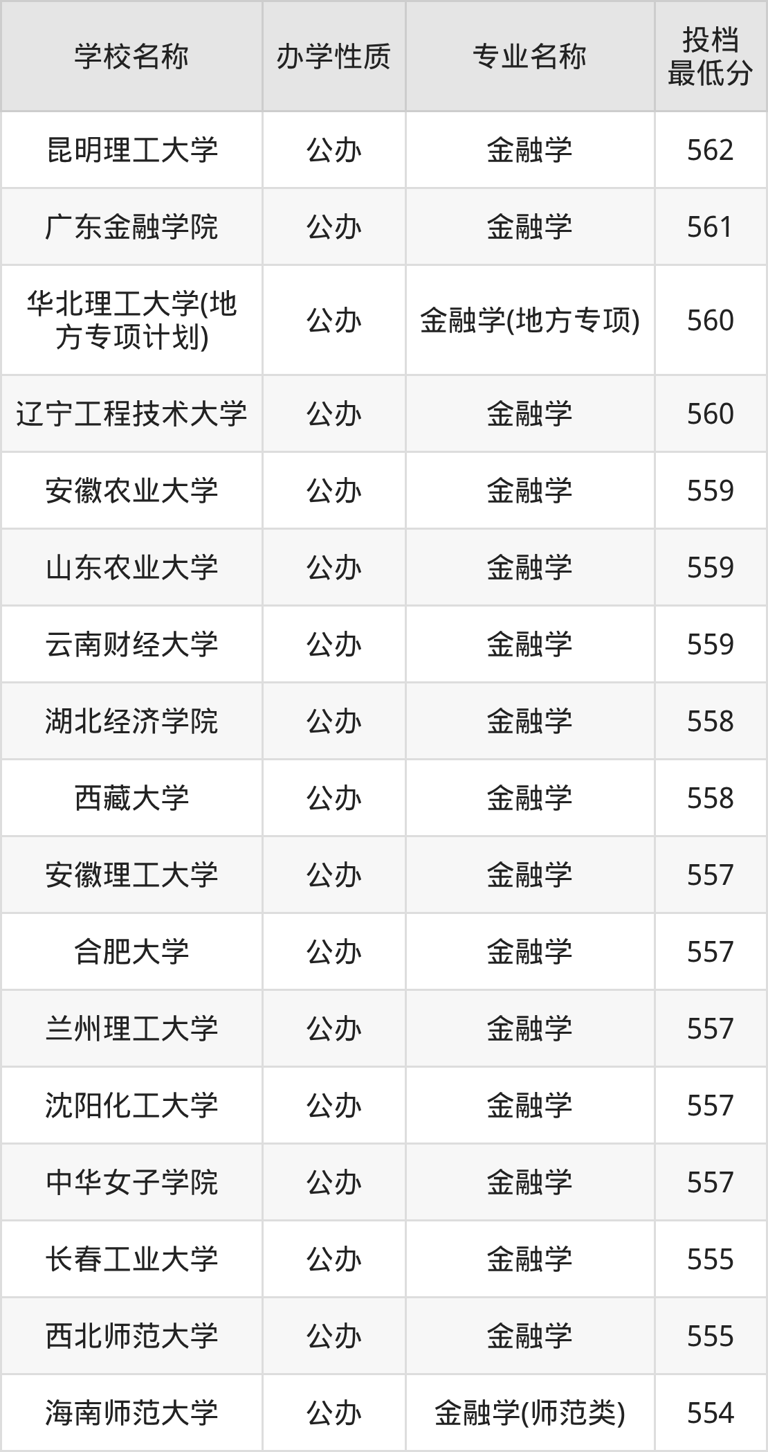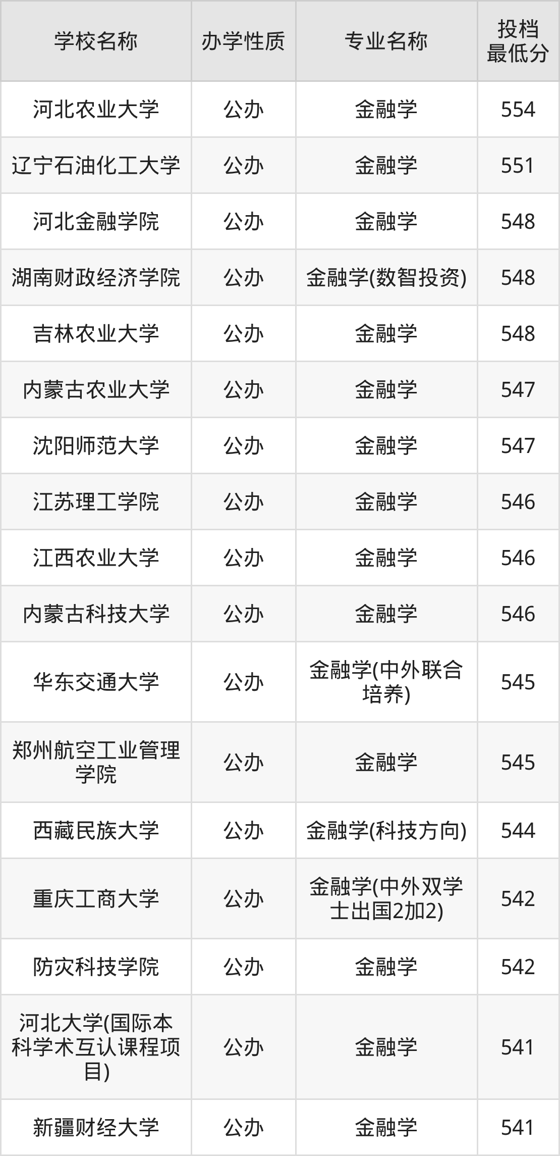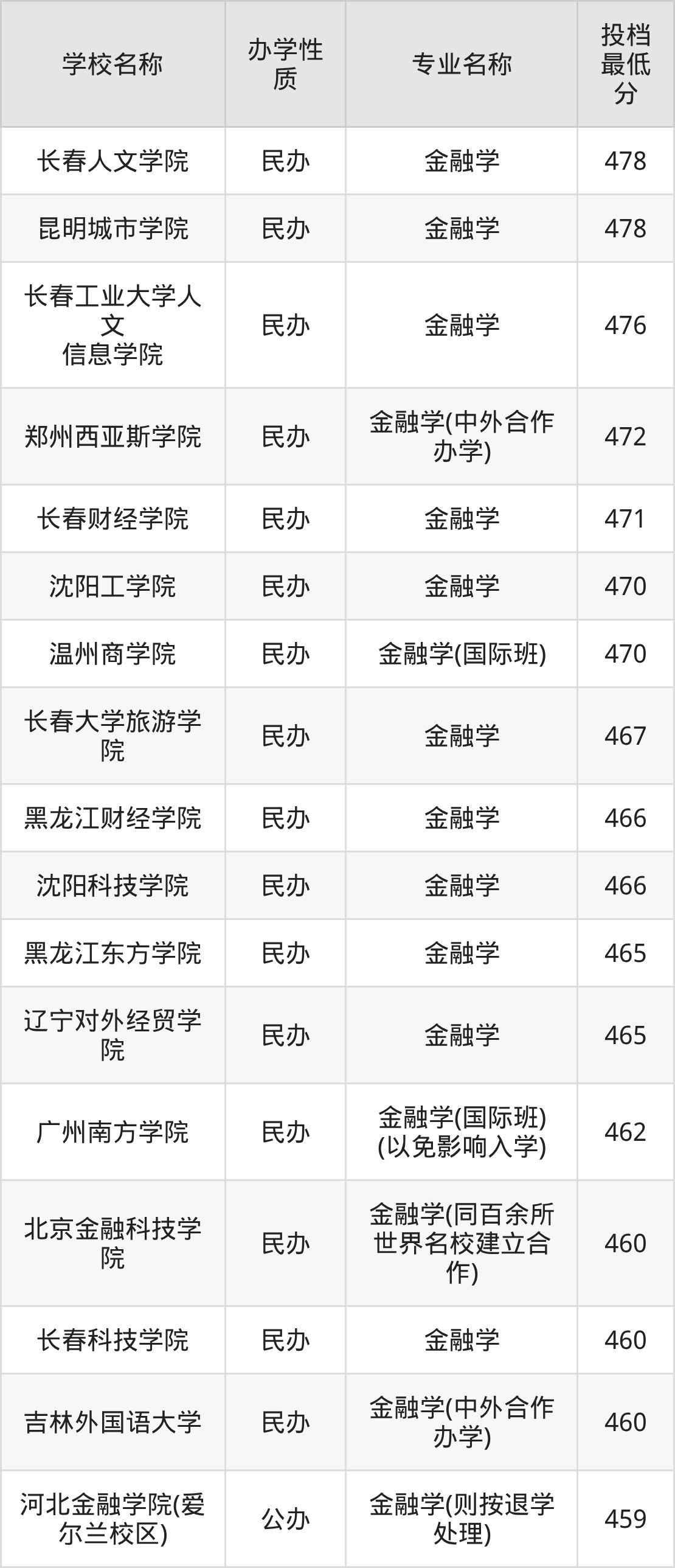 金融学专业收分最低的公办大学是河北金融学院(爱尔兰校区),2025年最低分459分,超本科线0分。可见金融学专业的招生门槛是非常高的,如果想要上一所公办本科大学的金融学专业,至少需要过本科线0分及以上。