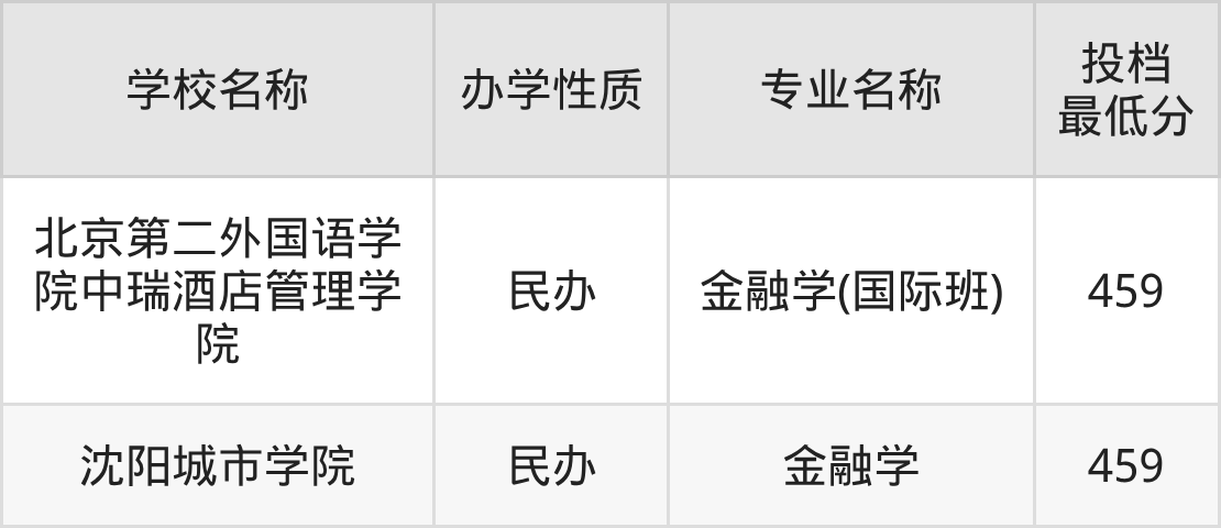 2025年金融学专业最低录取分数线是459分,刚好在本科分数线(459分)处。也就是说想报考金融学专业的同学,至少得达到本科线459分及以上。金融学专业最低分的大学是沈阳城市学院,不过该校属于民办。