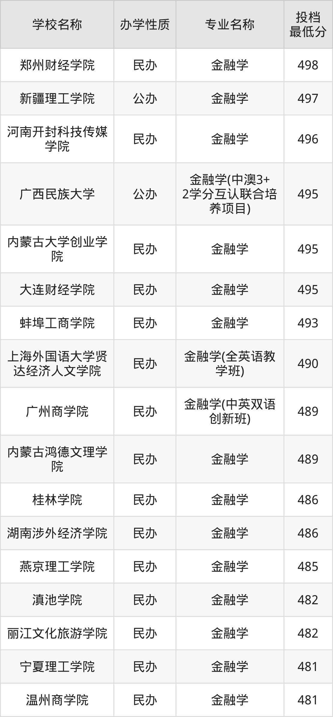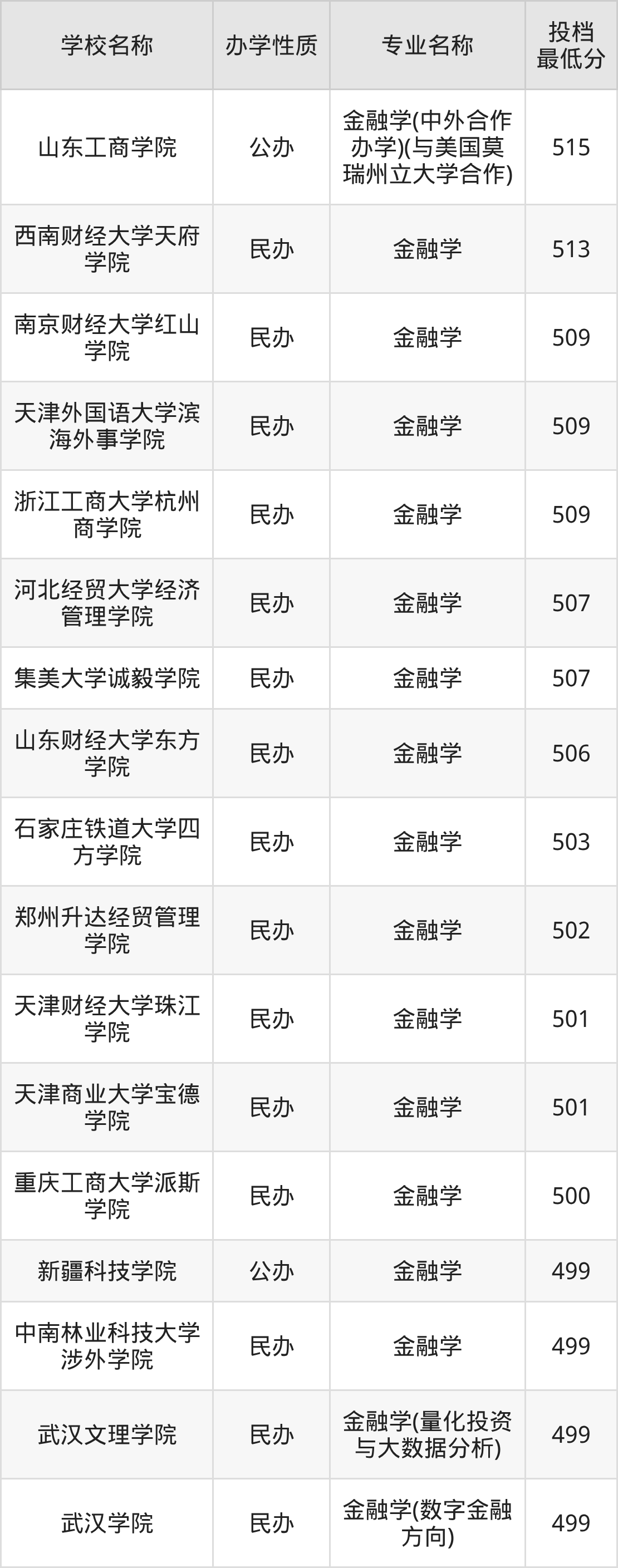 500分左右的金融学大学:天津商业大学宝德学院501分、天津财经大学珠江学院501分、郑州升达经贸管理学院502分、石家庄铁道大学四方学院503分、山东财经大学东方学院506分等;
