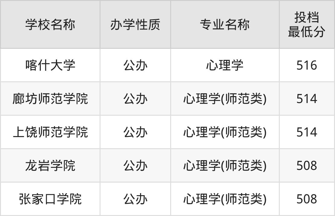 500分左右的心理学大学:张家口学院508分(师范类)、龙岩学院508分(师范类)、上饶师范学院514分(师范类)、廊坊师范学院514分(师范类)、喀什大学516分等;