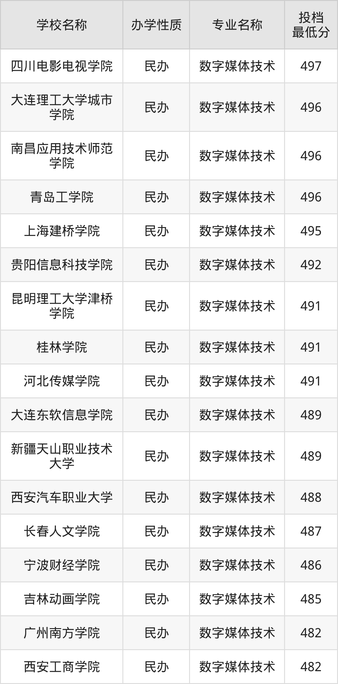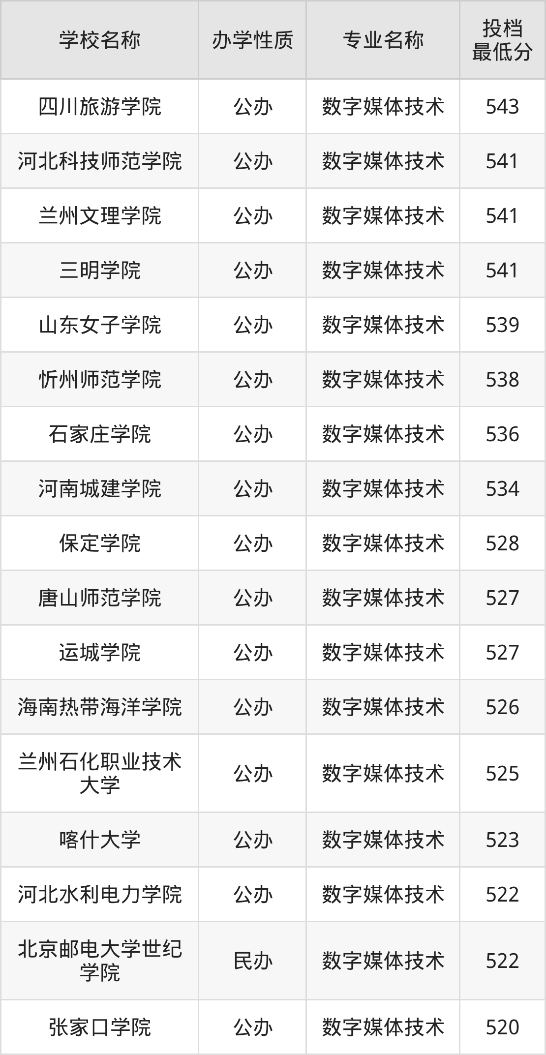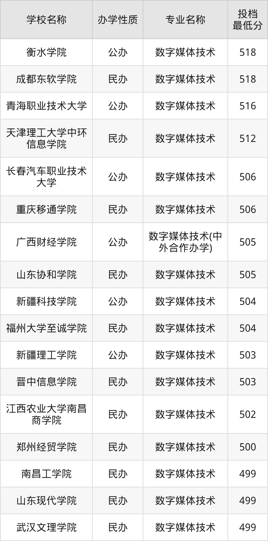 500分左右的数字媒体技术大学:江西农业大学南昌商学院502分、晋中信息学院503分、新疆理工学院503分、福州大学至诚学院504分、新疆科技学院504分等;