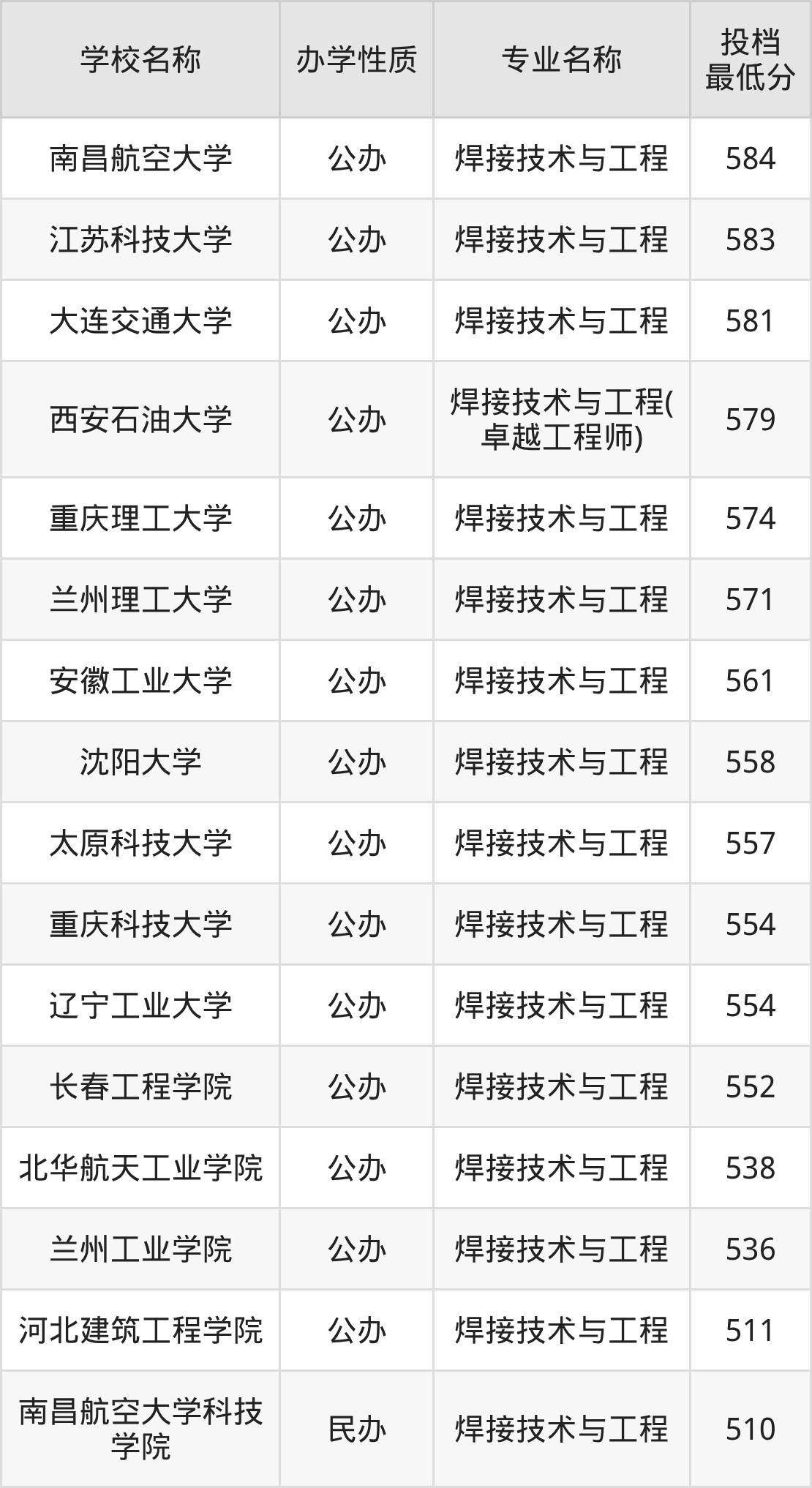 下面是2025年全国所有大学焊接技术与工程专业录取分数线一览表(按照分数线从高到低排名):