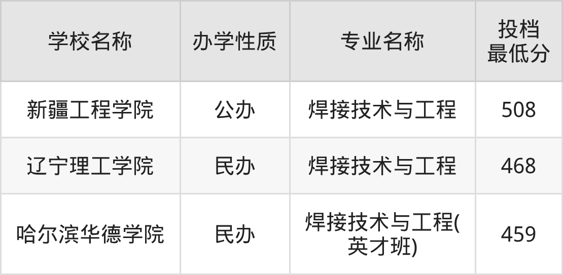 2025年焊接技术与工程专业最低录取分数线是459分,刚好在本科分数线(459分)处。也就是说想报考焊接技术与工程专业的同学,至少得达到本科线459分及以上。焊接技术与工程专业最低分的大学是哈尔滨华德学院,不过该校属于民办。