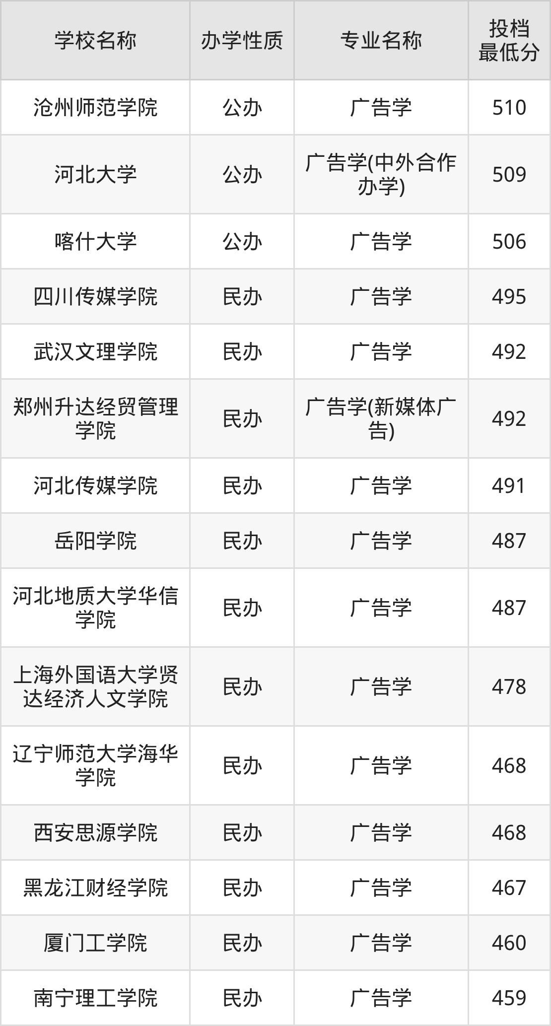 分数线最低、最好考的是南宁理工学院,学校广告学最低分是459,超本科线0分,不过这所学校是民办性质。2025公办大学最低分是506,收分最低的学校是喀什大学,超本科线47分能上。