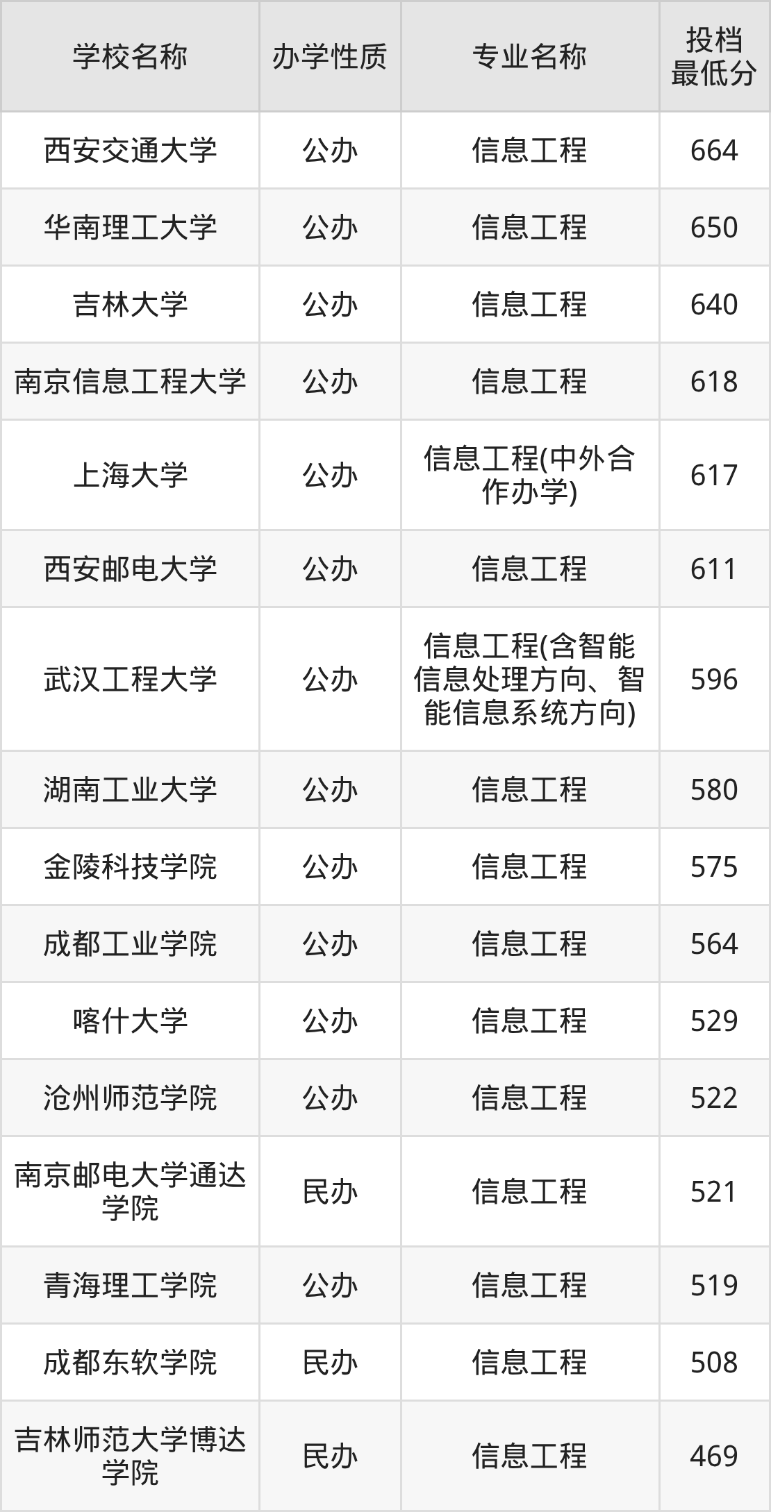 下面是2025年全国所有大学信息工程专业录取分数线一览表(按照分数线从高到低排名):