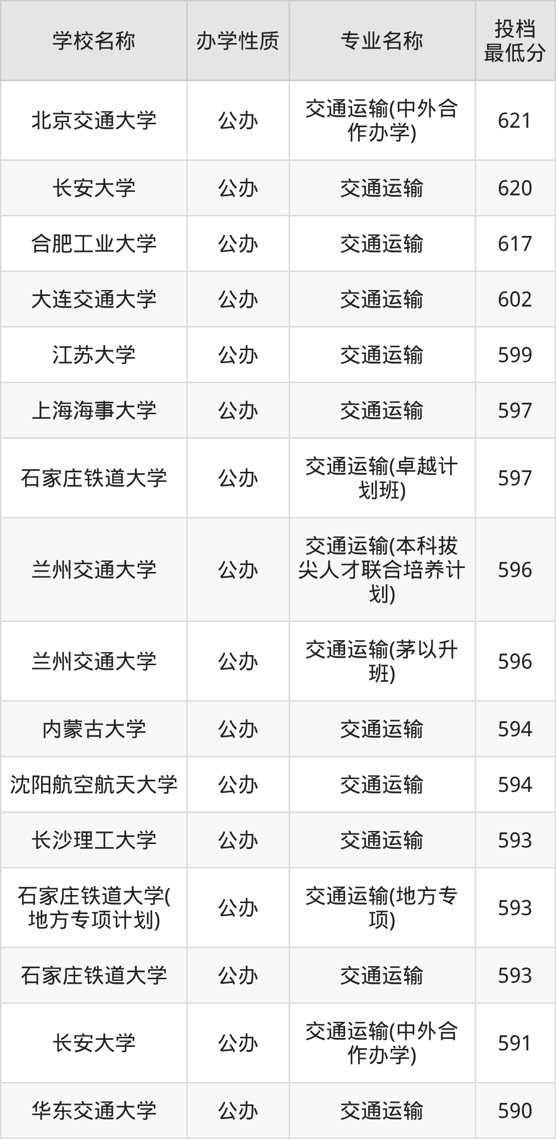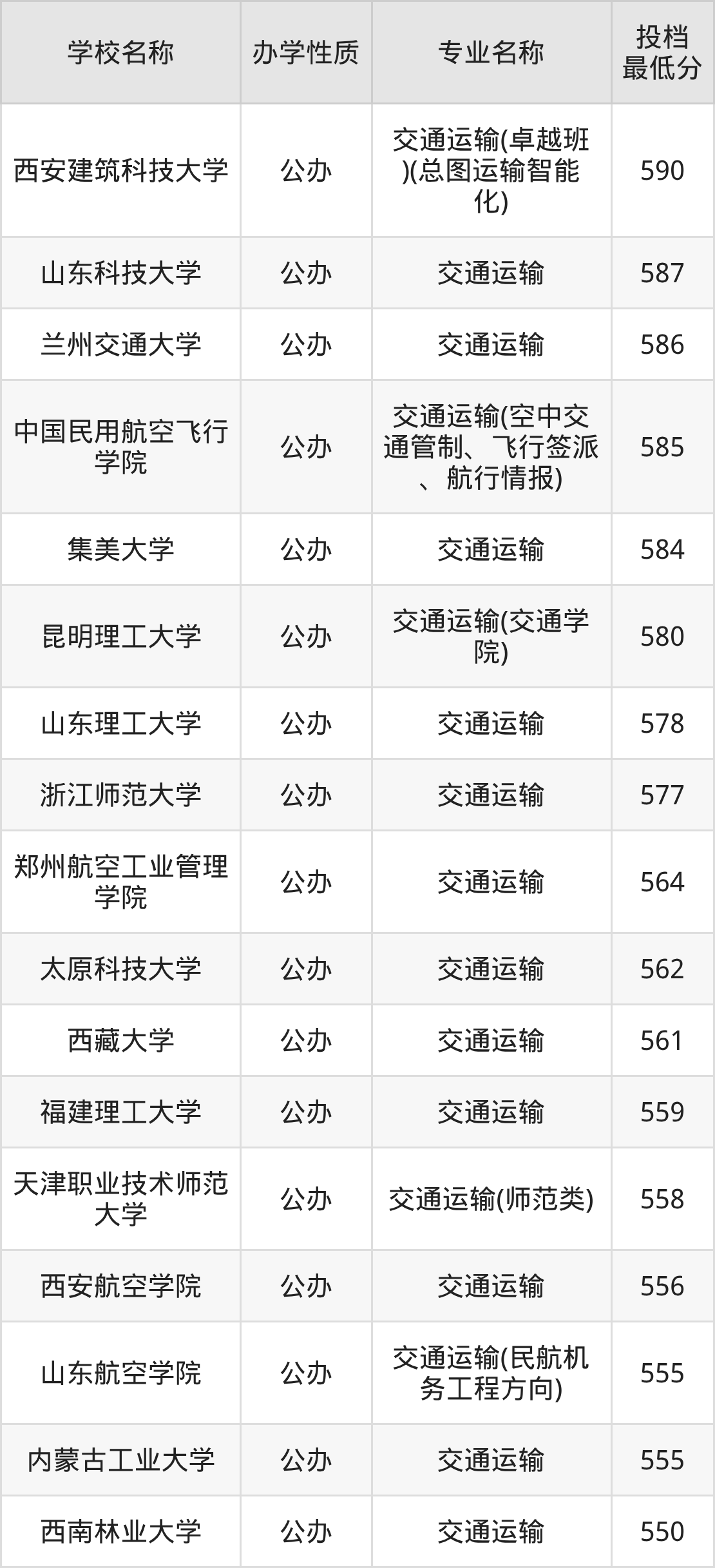 下面是2025年全国所有大学交通运输专业录取分数线一览表(按照分数线从高到低排名):