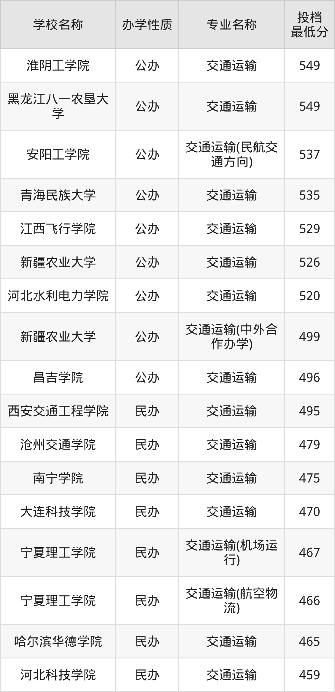 500分左右的交通运输大学:河北水利电力学院520分、新疆农业大学526分、江西飞行学院529分、青海民族大学535分、安阳工学院537分(民航交通方向)等;