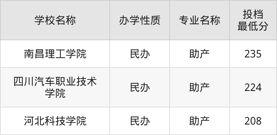 另外分数线比较低的大学还有四川汽车职业技术学院(224分)、南昌理工学院(235分)、邯郸应用技术职业学院(238分)、内蒙古北方职业技术学院(250分)、石家庄医学高等专科学校(251分)等。