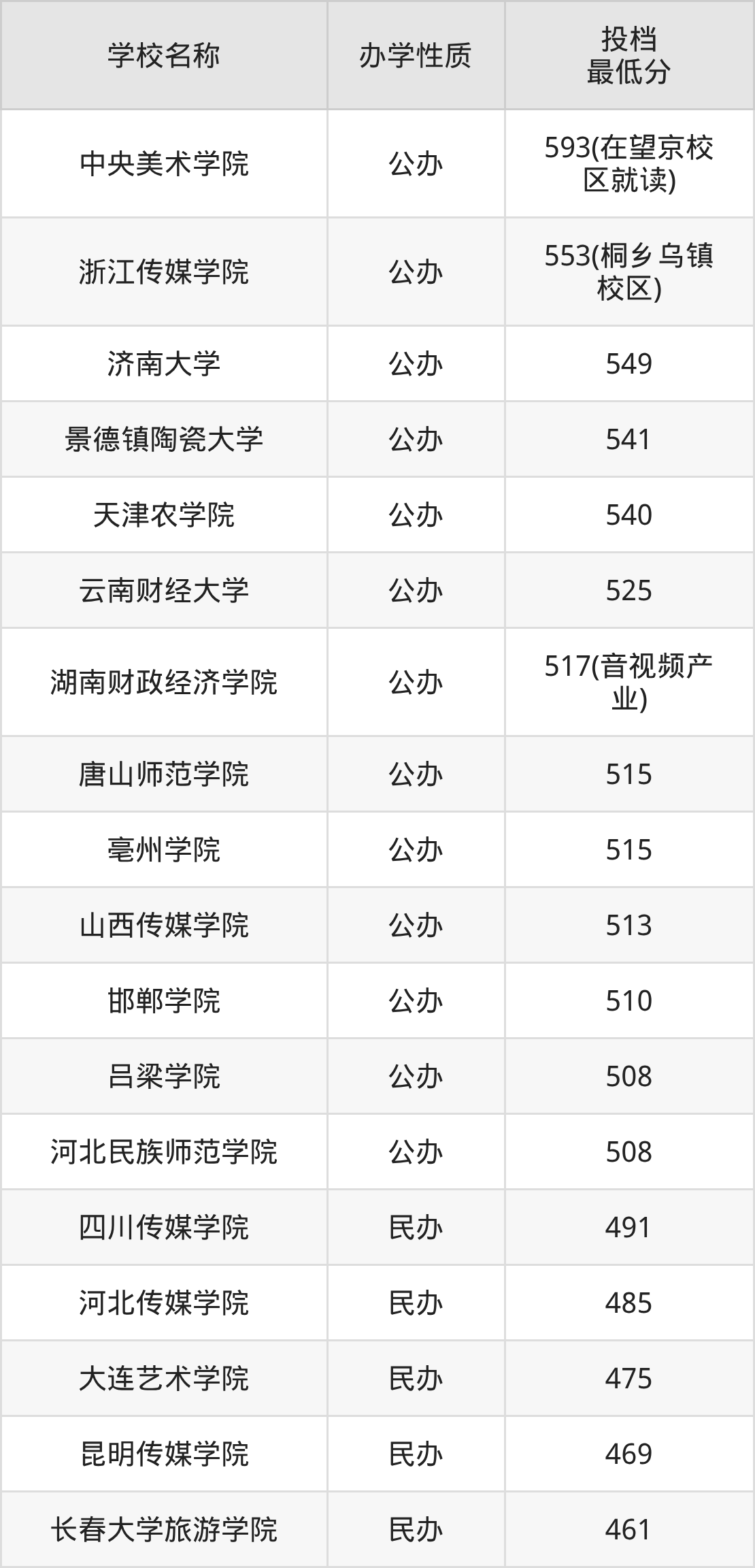 另外分数线比较低的大学还有昆明传媒学院(469分)、大连艺术学院(475分)、河北传媒学院(485分)、四川传媒学院(491分)、吕梁学院(508分)等。