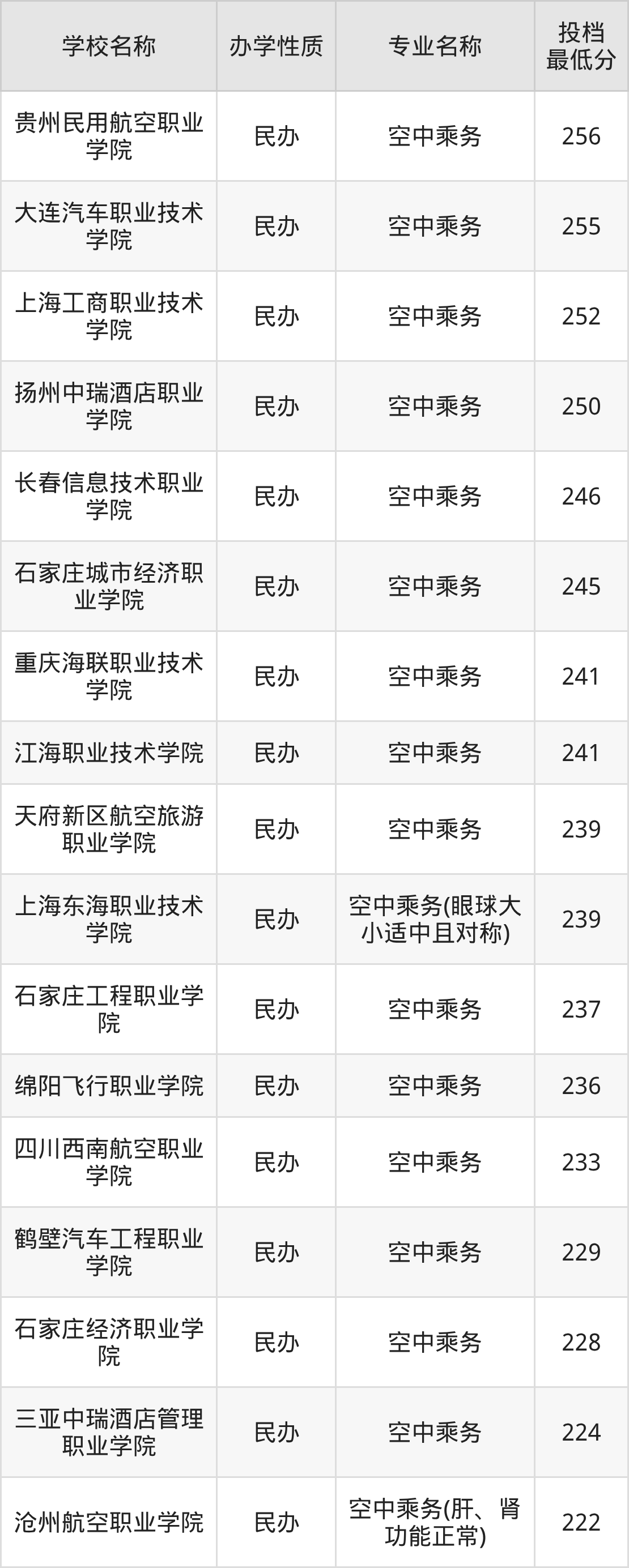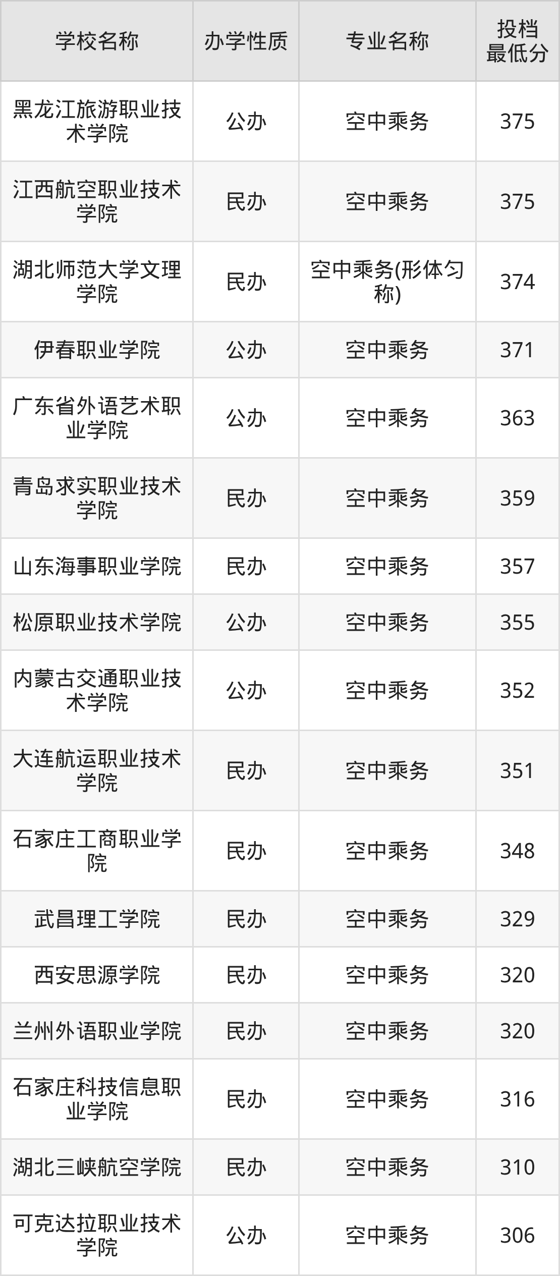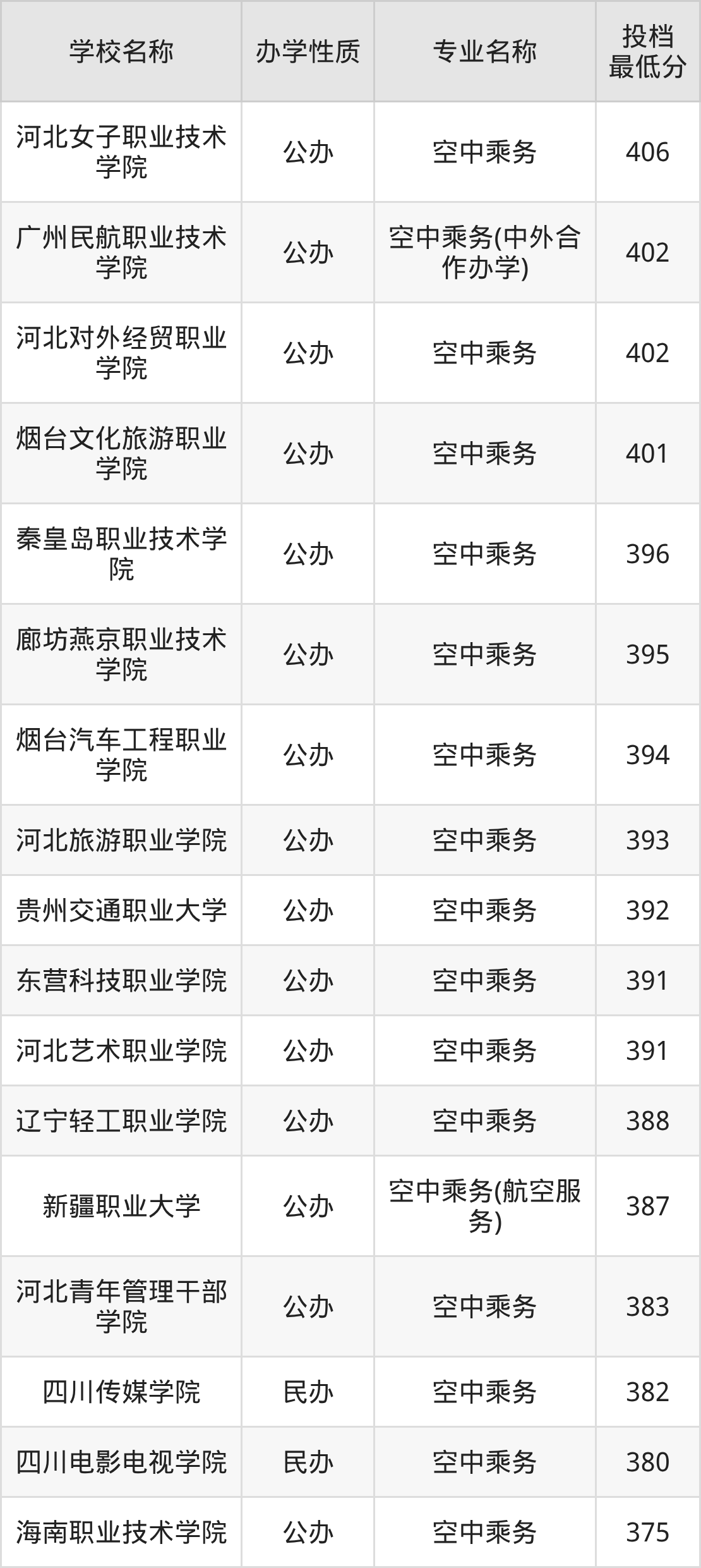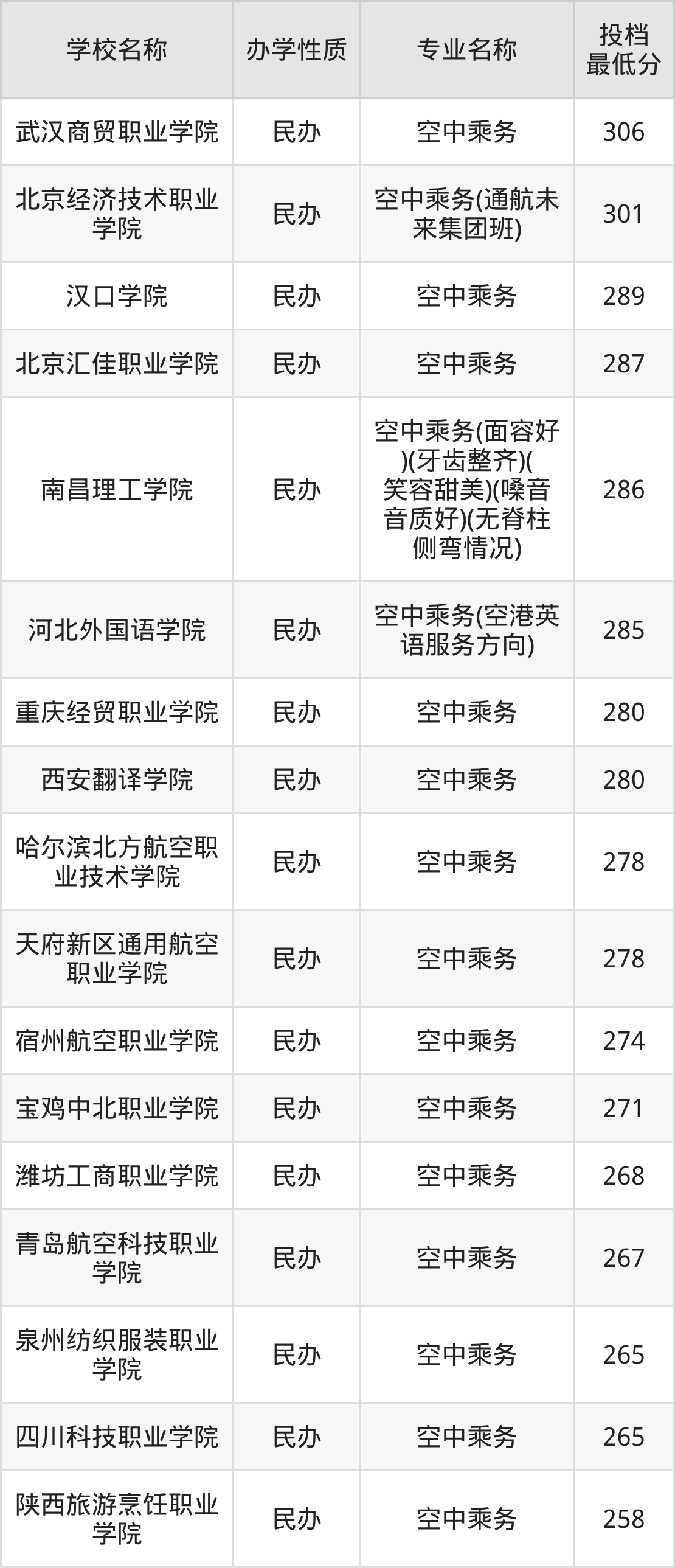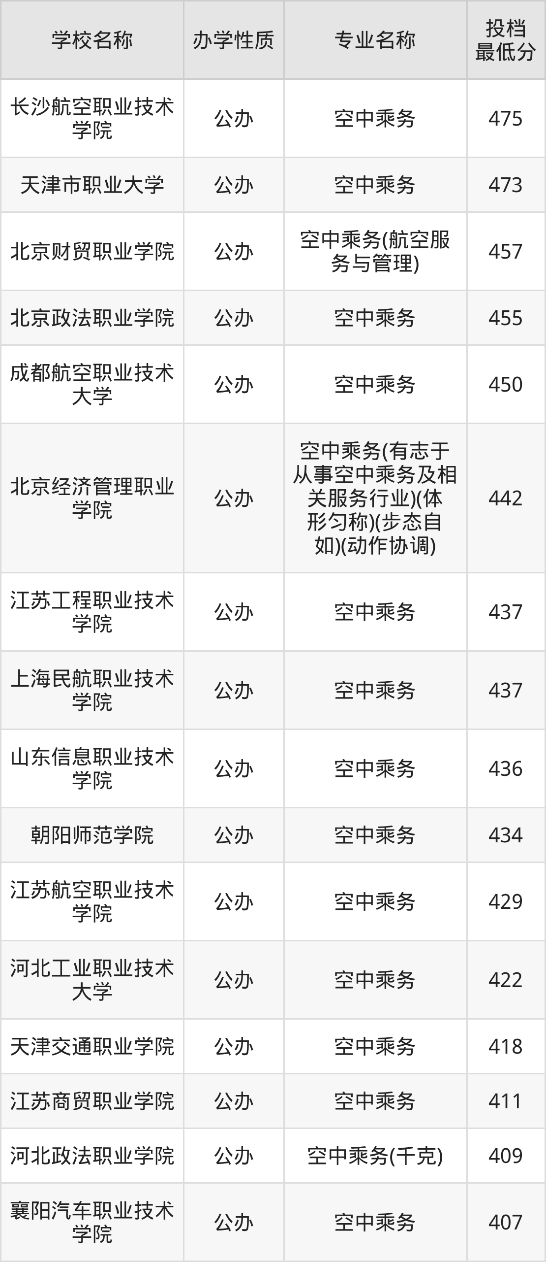 二、全国空中乘务录取分数线排名表