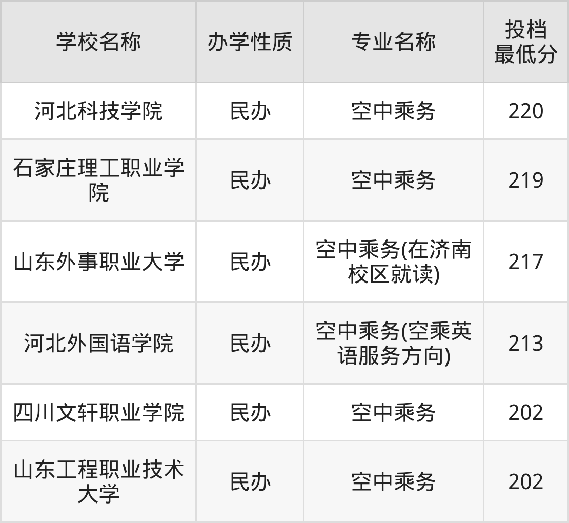 一般来说,空中乘务都需要200分以上才能被录取,当然分数线因省份、科类而不同。从河北省2025年的招录数据来看,2025年空中乘务专业最低分是202分,而河北省专科线是200分,意味着考生至少需超过专科线2分才能上。