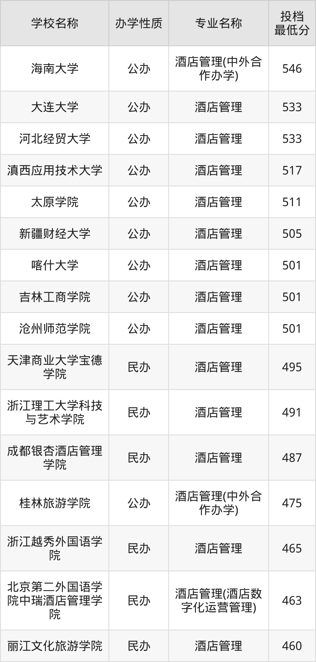 2025年全国酒店管理专业录取分数线从460分到546分不等,各校最低分数线存在较大差异。