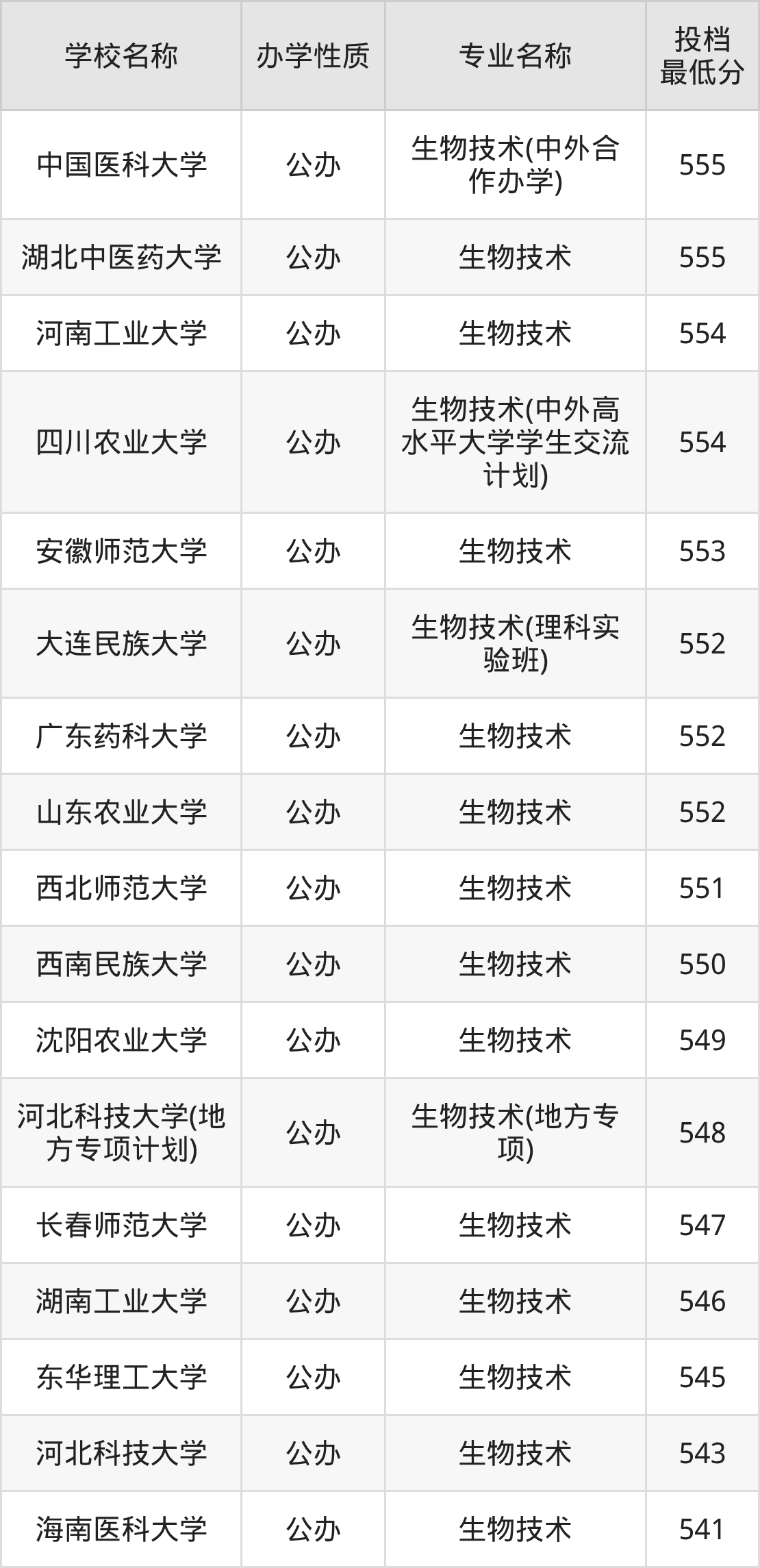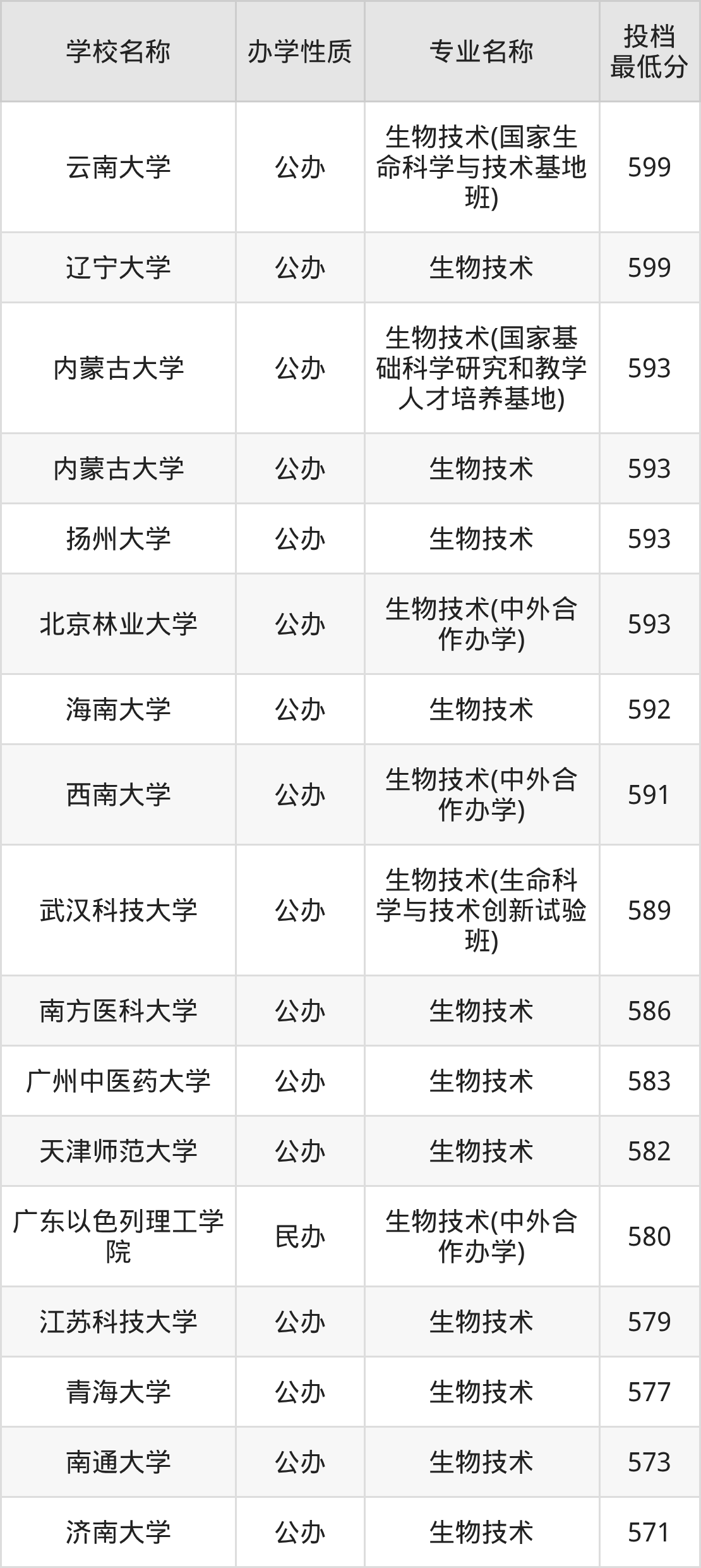 下面是全国各个大学生物技术专业最低录取分数线排名一览表,考生可根据自己的分数情况选择合适的学校报考。