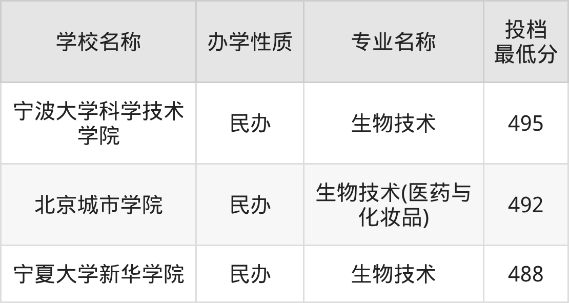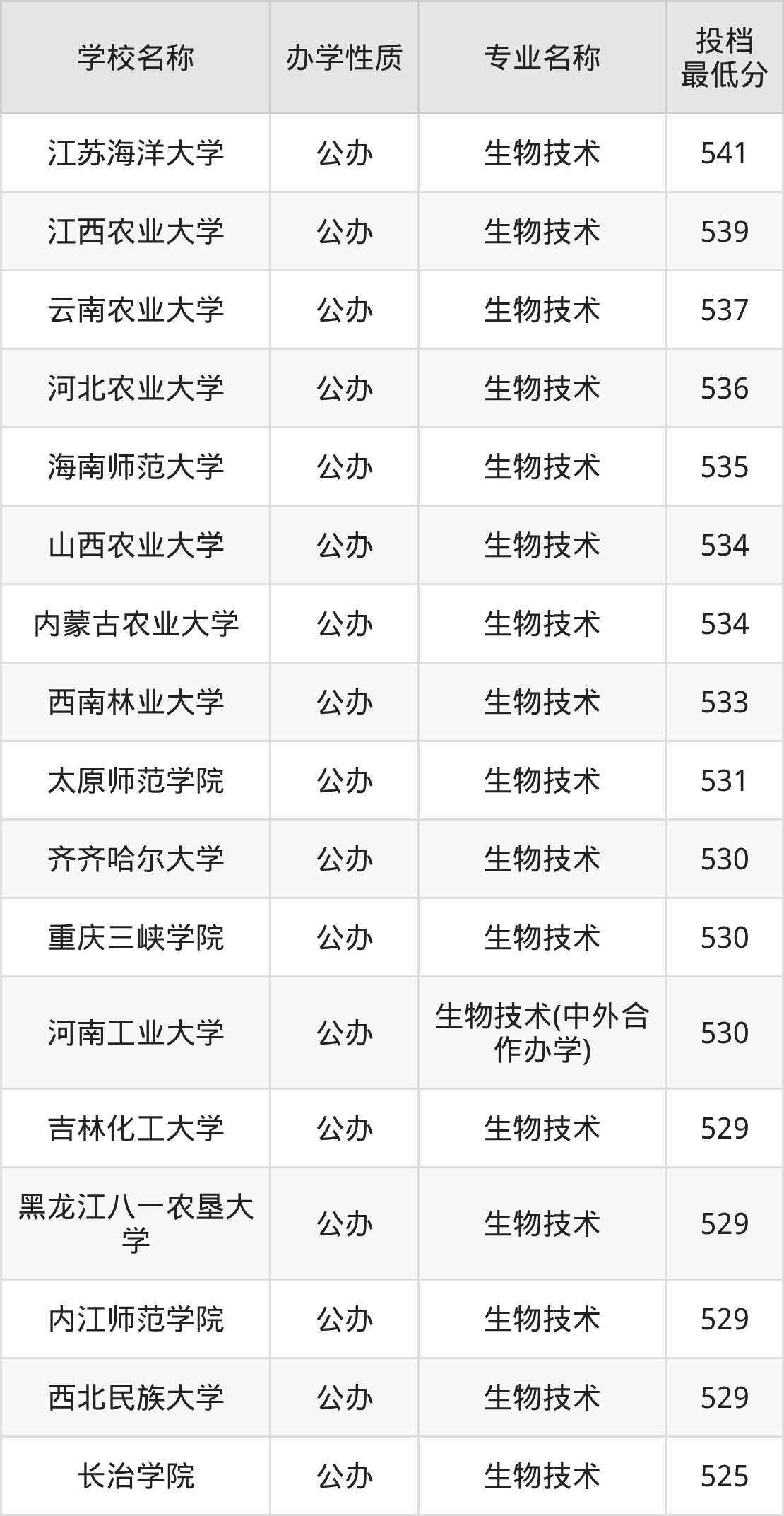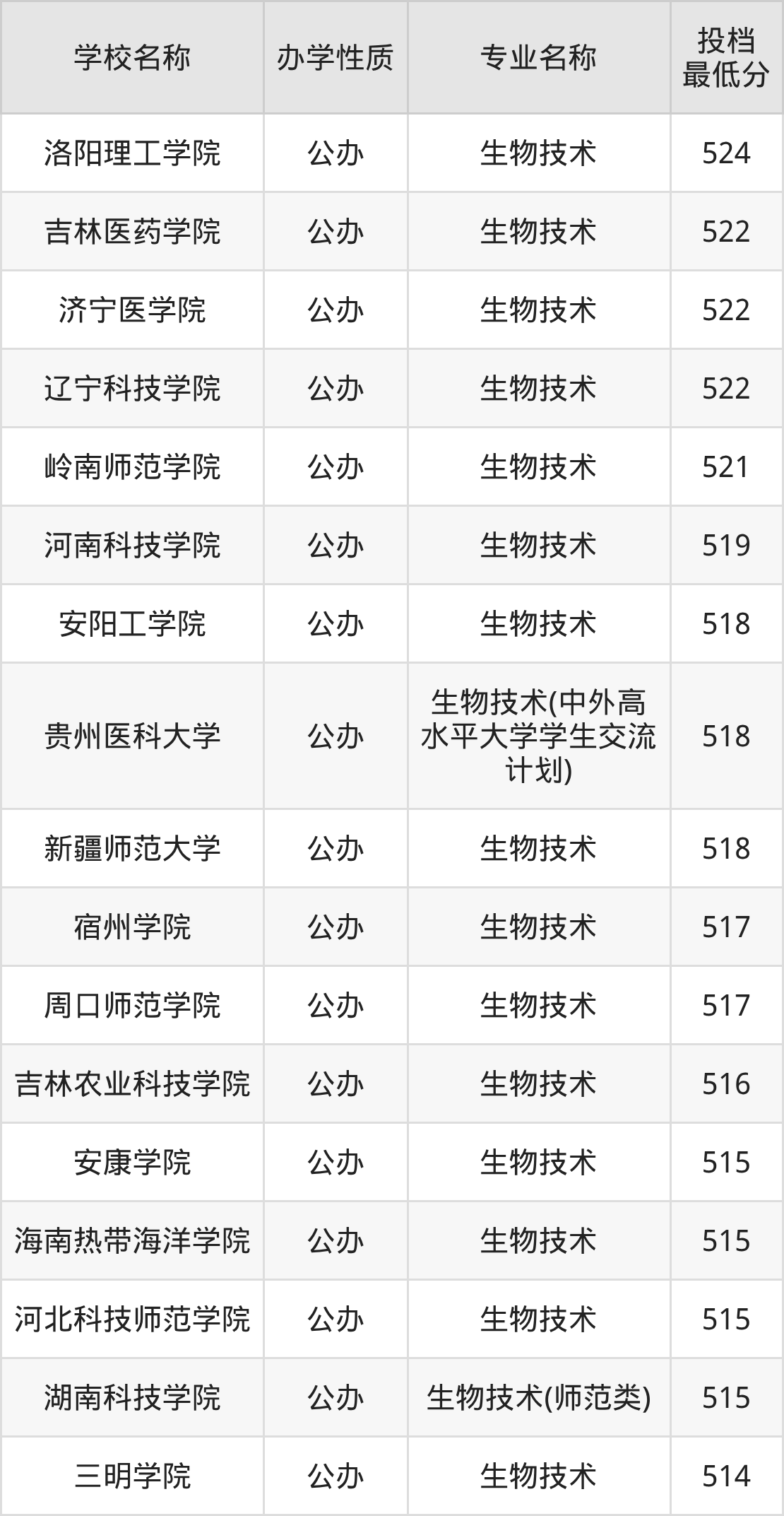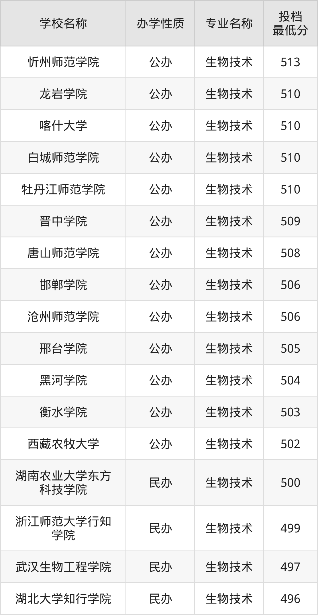分数线最低、最好考的是宁夏大学新华学院,学校生物技术最低分是488,超本科线29分,不过这所学校是民办性质。2025公办大学最低分是502,收分最低的学校是西藏农牧大学,超本科线43分能上。