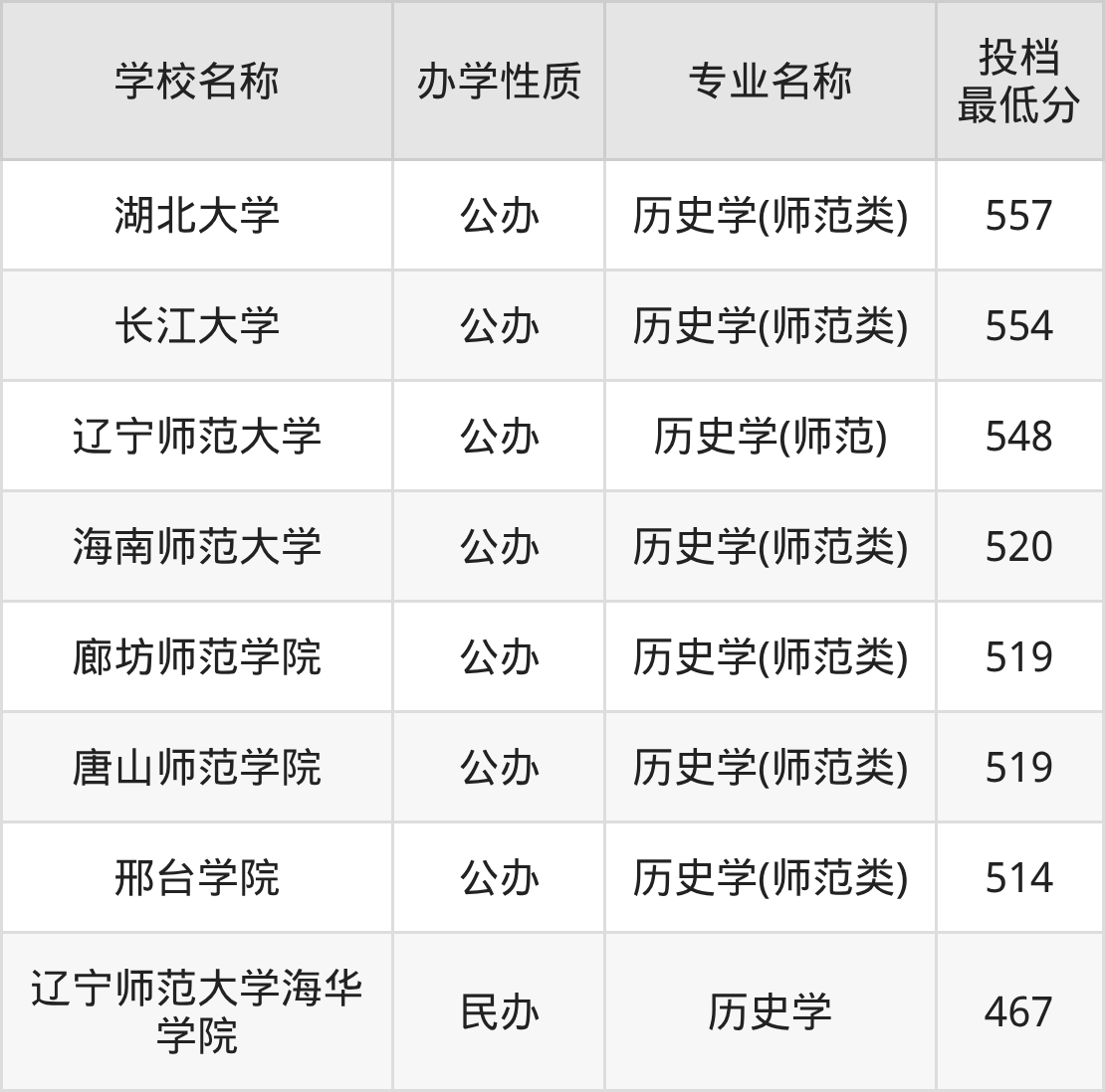 2025年历史学专业最低录取分数线位于467分到557分之间,收分最低的大学是辽宁师范大学海华学院。历史学排名靠前的大学包括湖北大学、长江大学、辽宁师范大学、海南师范大学、廊坊师范学院等,各校最低分如下。