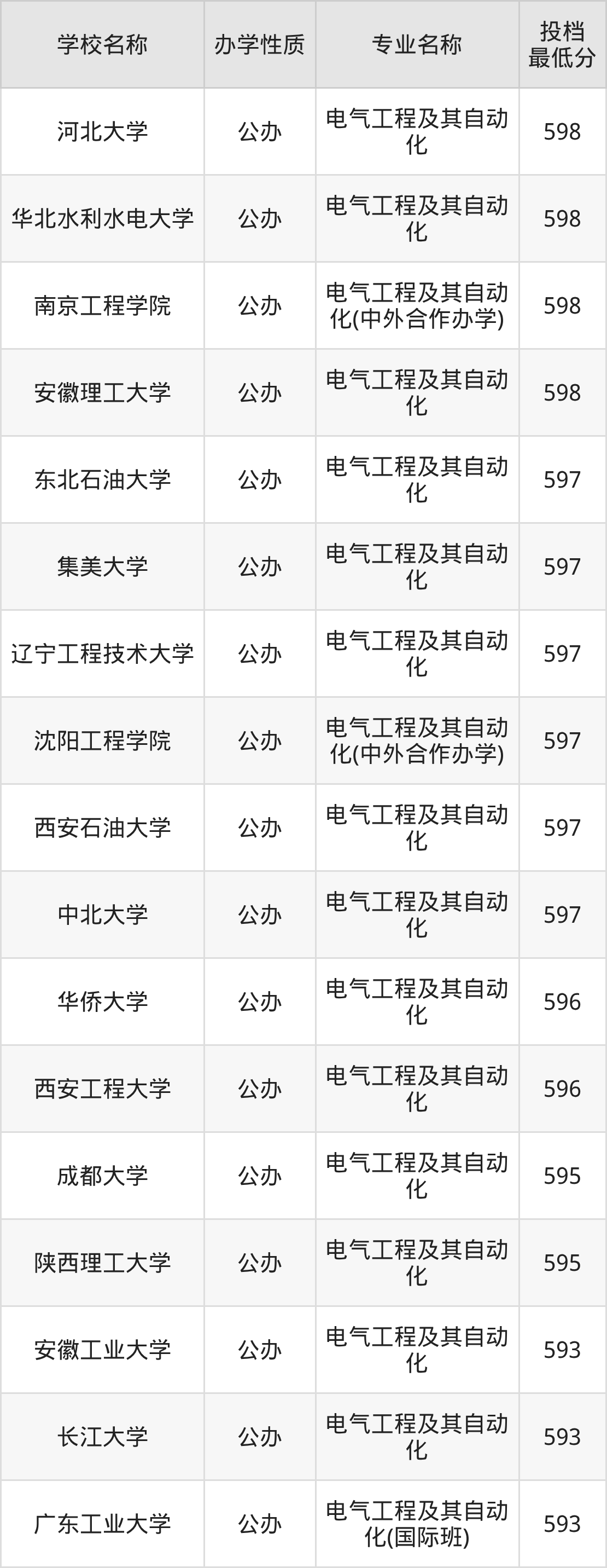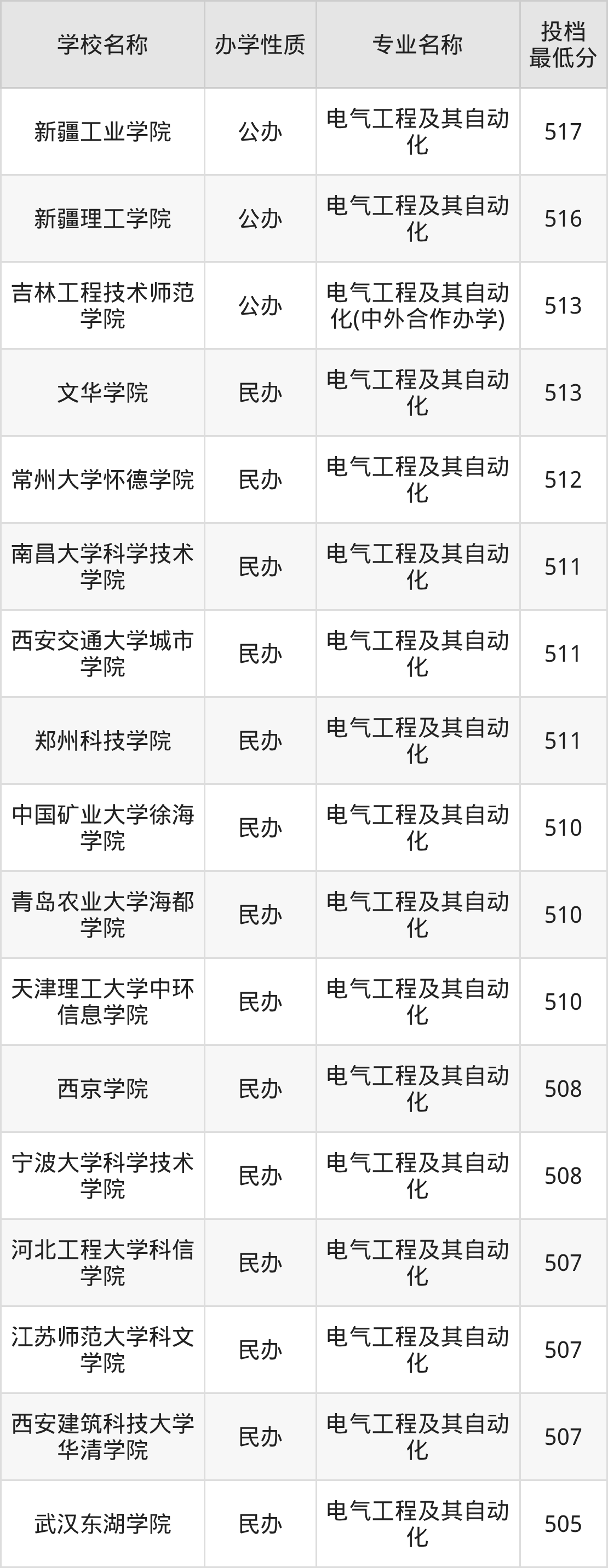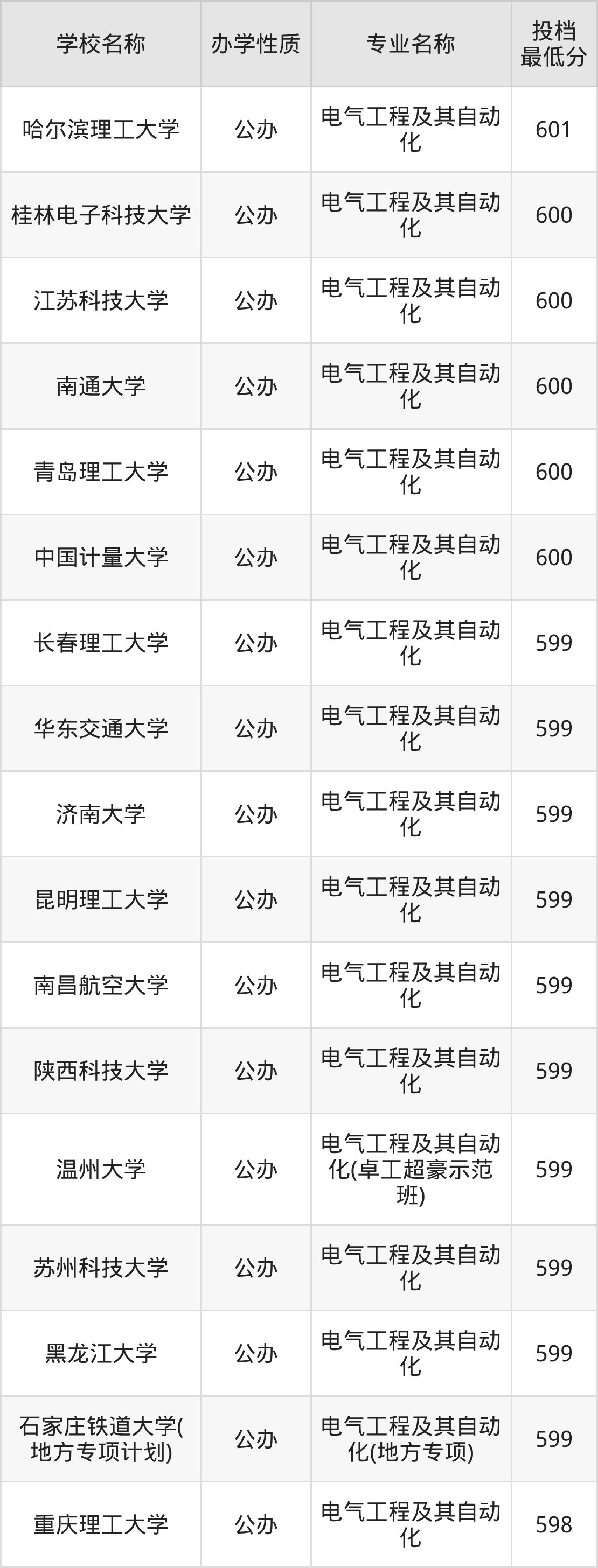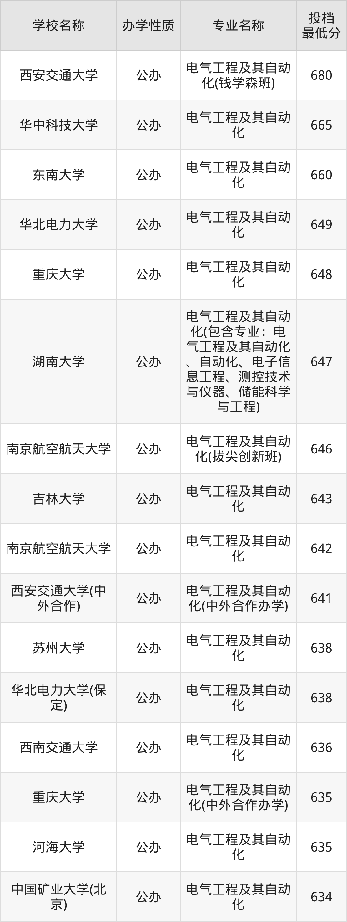 二、全国电气工程及其自动化录取分数线排名表