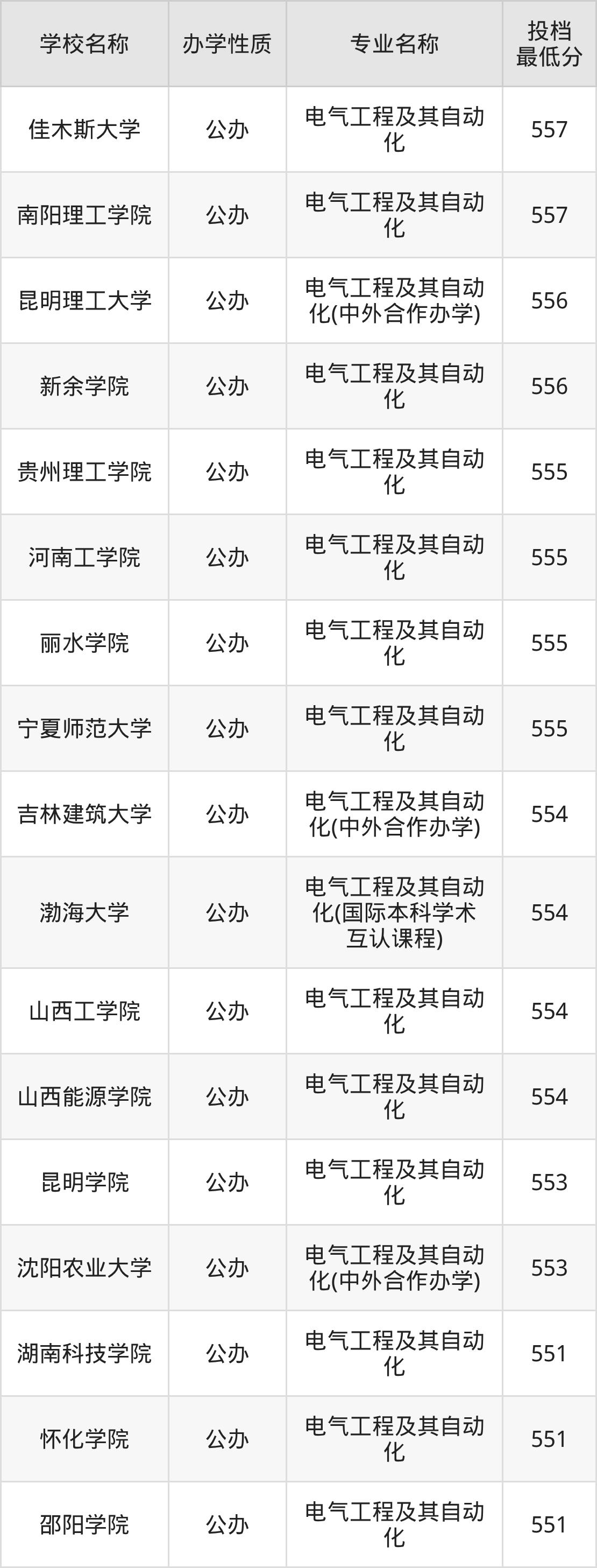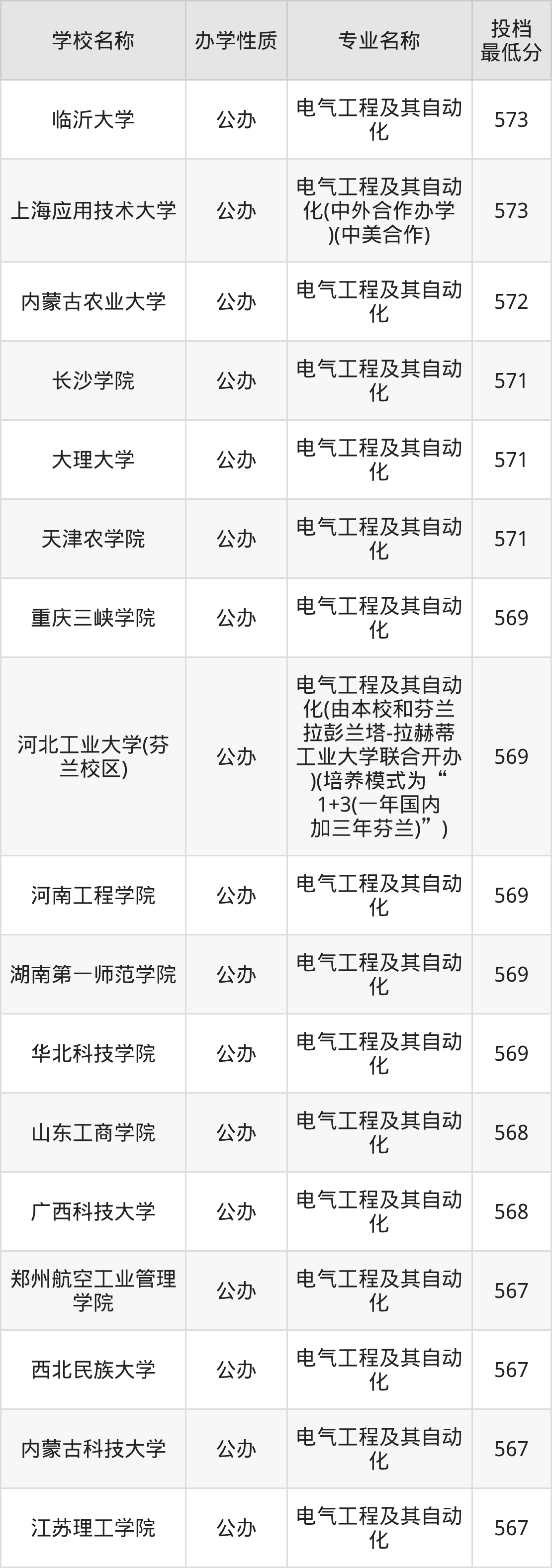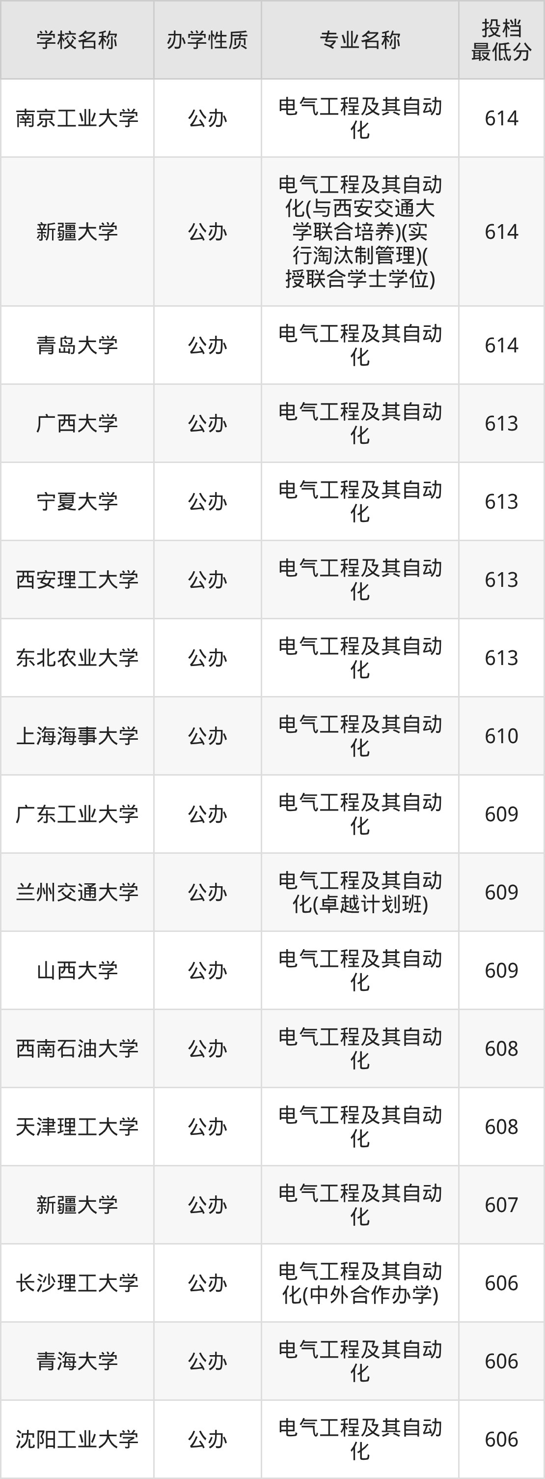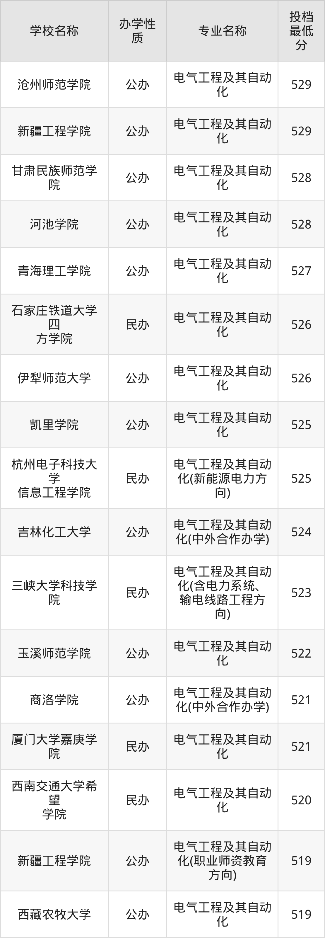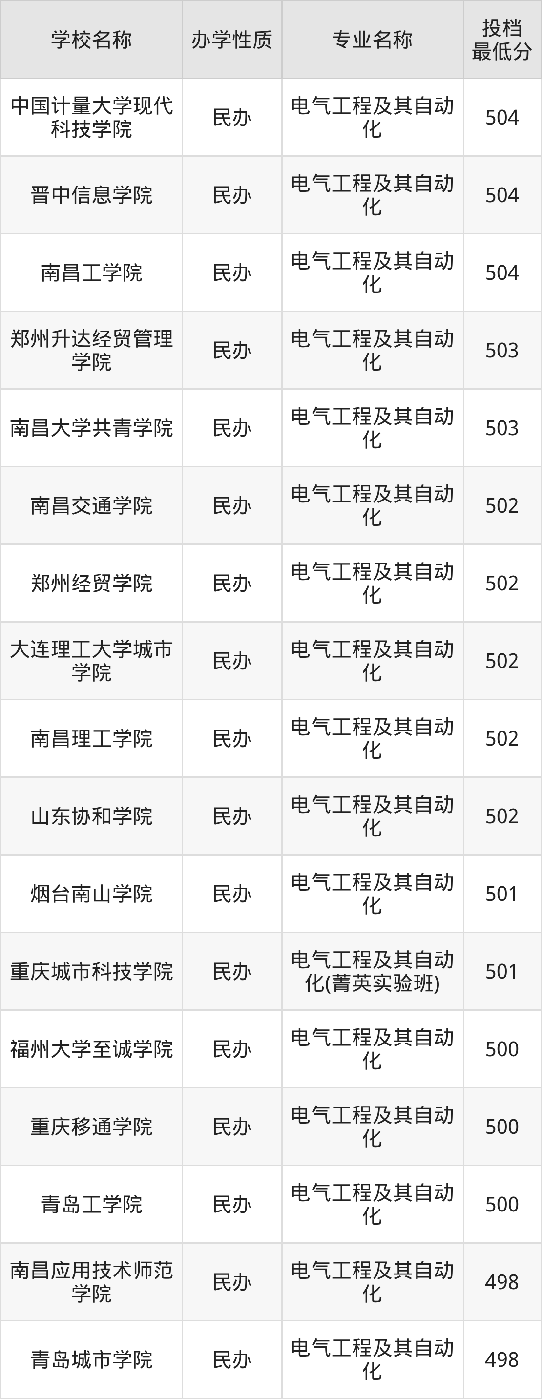 二、全国电气工程及其自动化录取分数线排名表