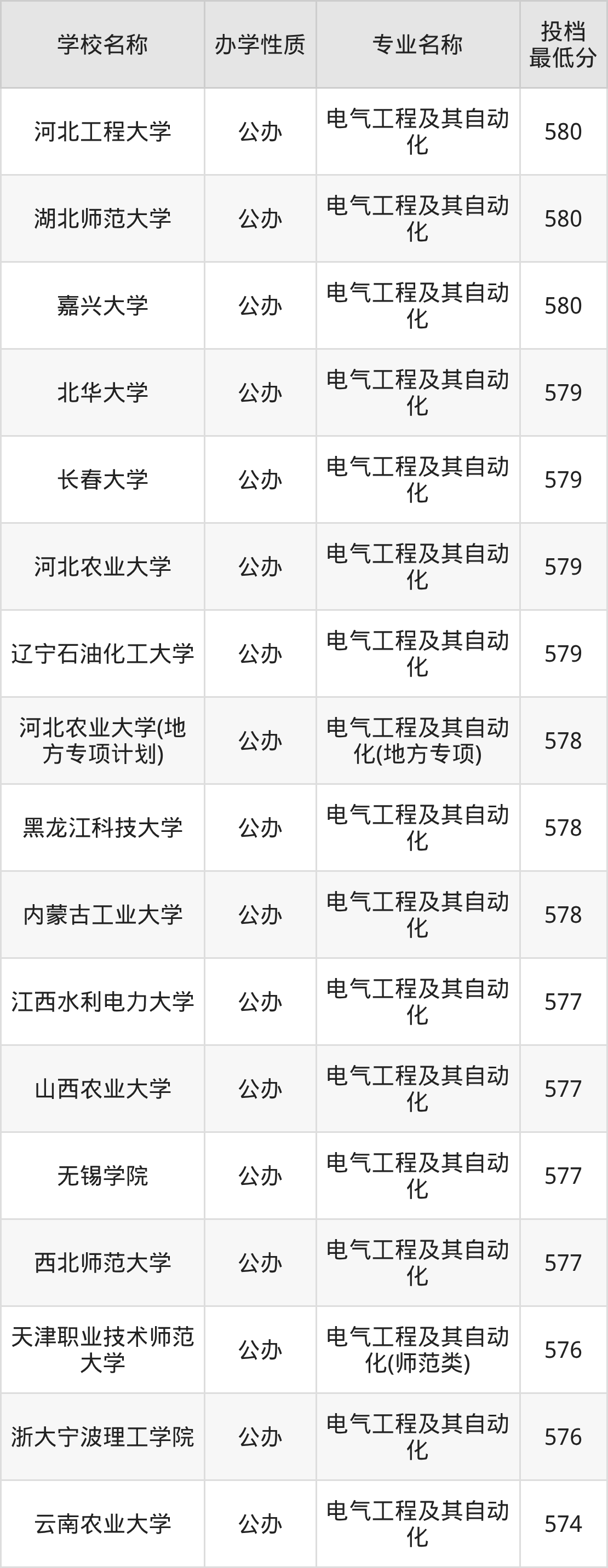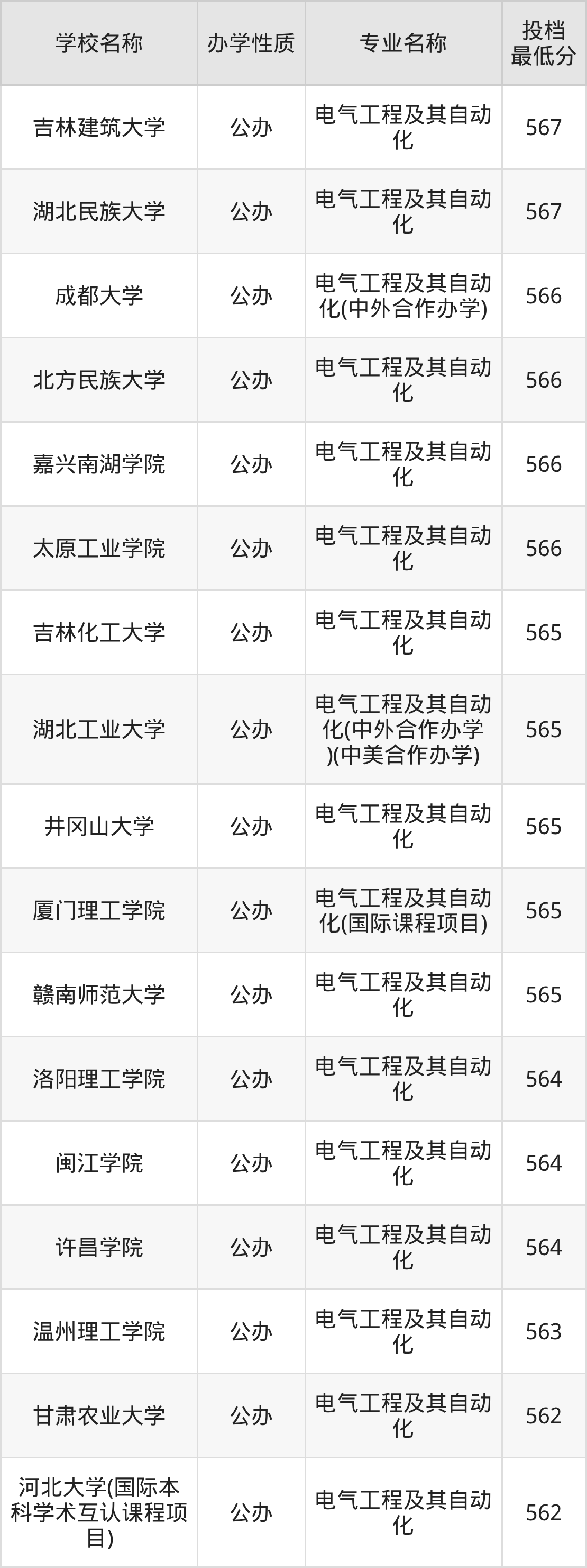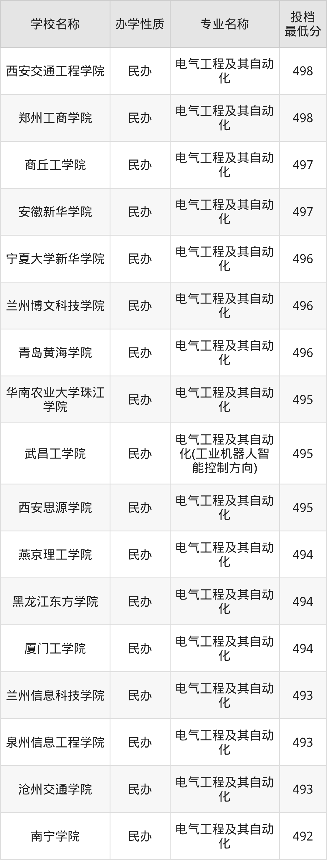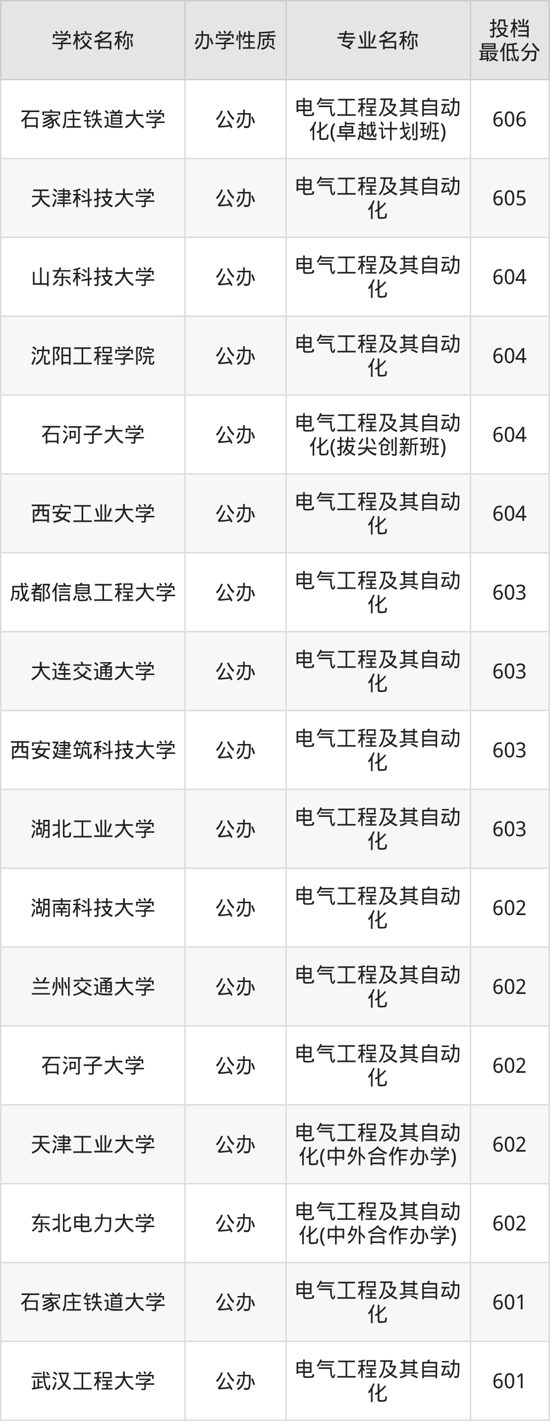 二、全国电气工程及其自动化录取分数线排名表