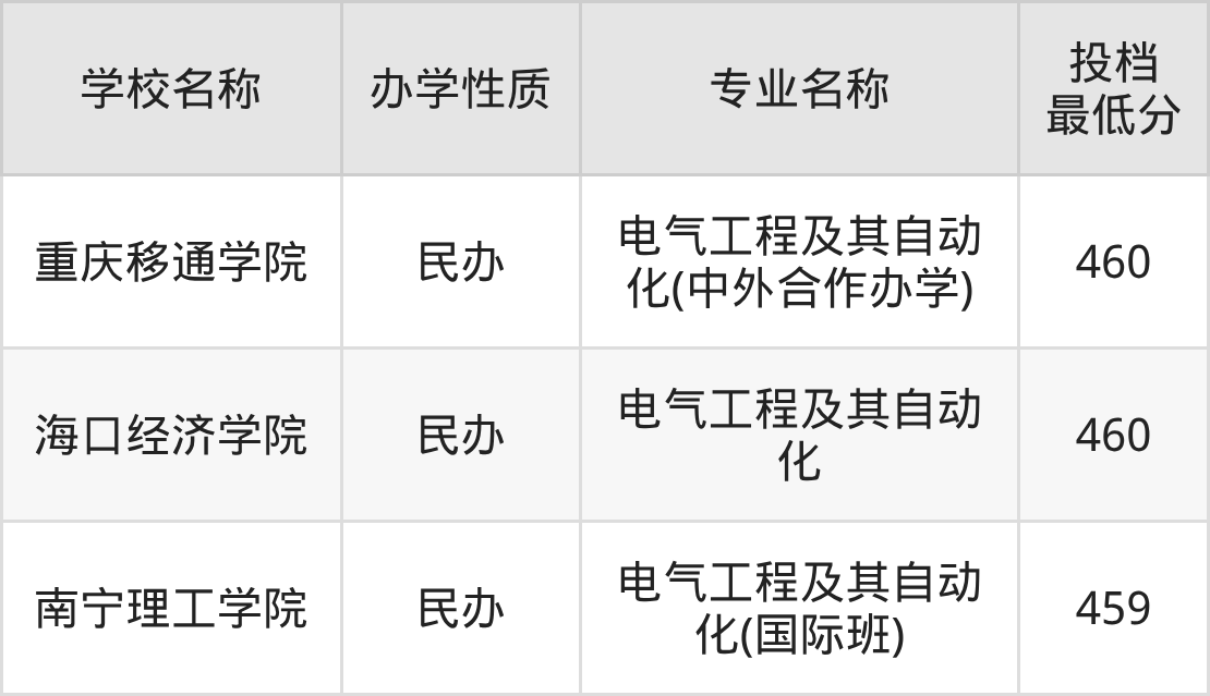 分数线最低、最好考的是南宁理工学院,学校电气工程及其自动化最低分是459,超本科线0分,不过这所学校是民办性质。2025公办大学最低分是513,收分最低的学校是吉林工程技术师范学院,超本科线54分能上。