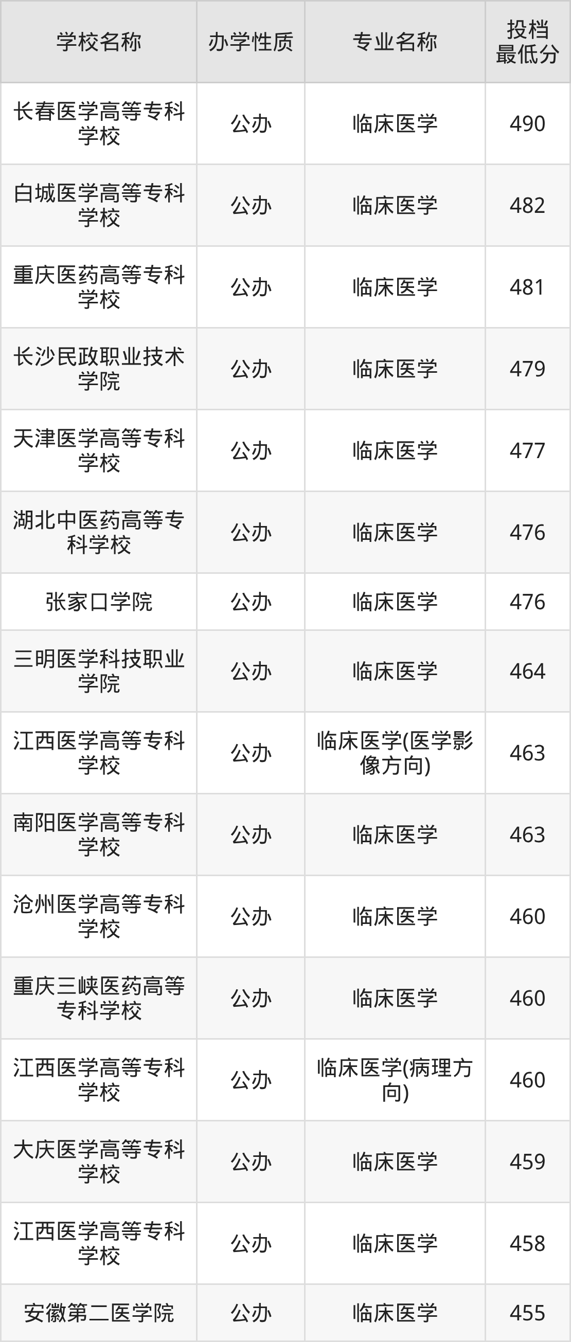 临床医学专业收分最高的大学是长春医学高等专科学校,2025年最低分490分,超专科线290分。分数线排名前五的大学还有:白城医学高等专科学校482分、重庆医药高等专科学校481分、长沙民政职业技术学院479分、天津医学高等专科学校477分。