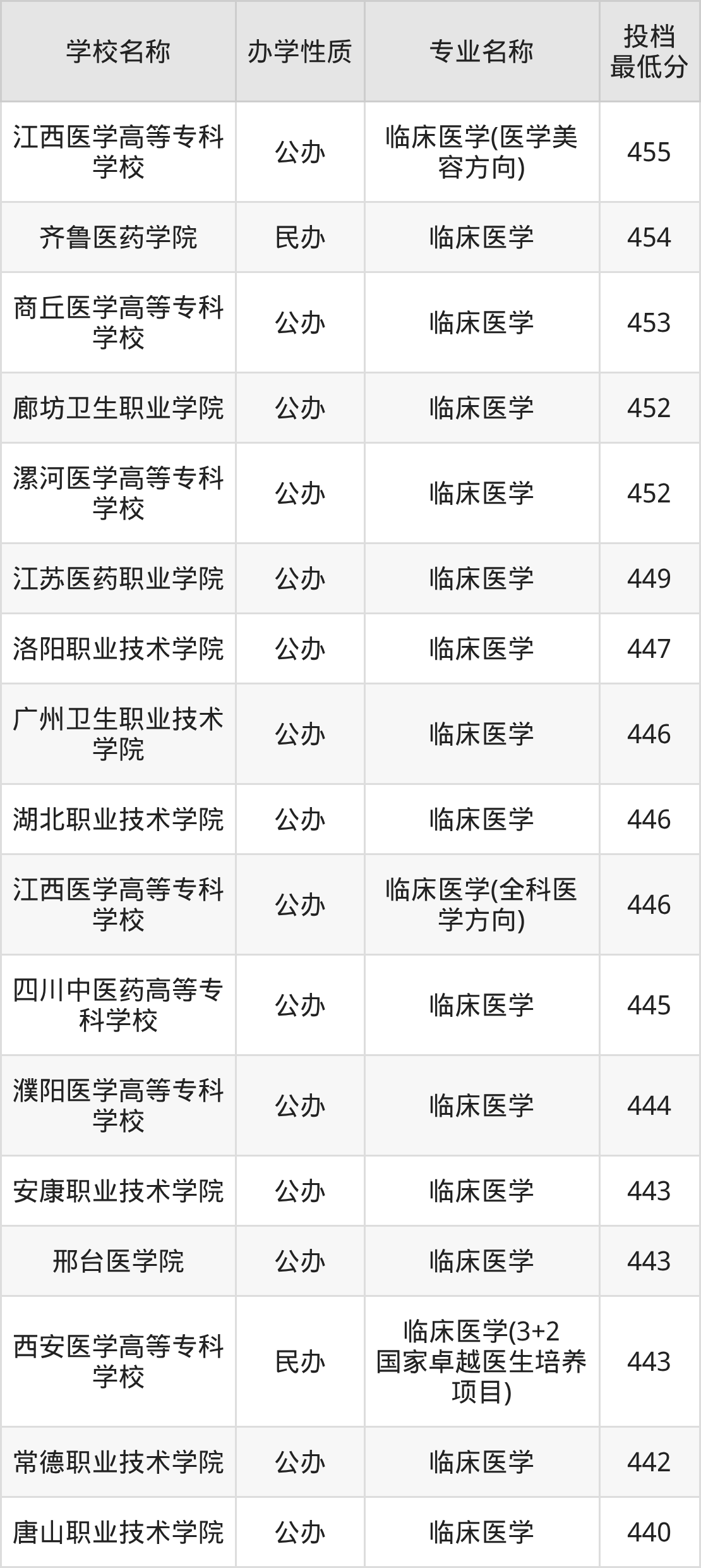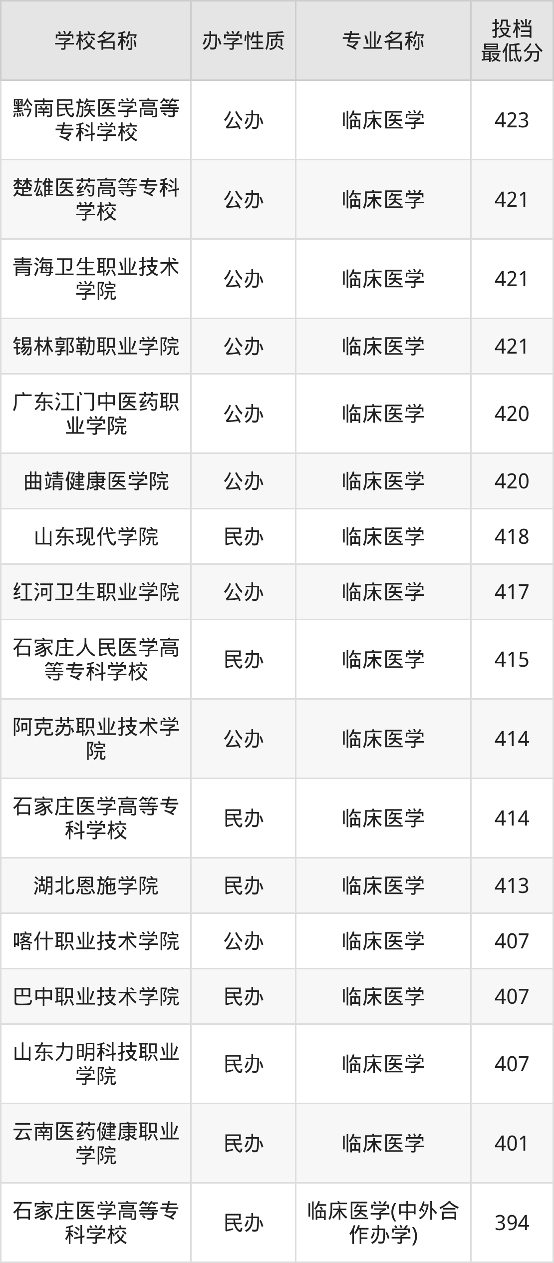 2025年临床医学专业最低录取分数线是394分,超专科分数线(200分)194分。也就是说想报考临床医学专业的同学,至少得超过专科线194分及以上。临床医学专业最低分的大学是石家庄医学高等专科学校,不过该校属于民办。