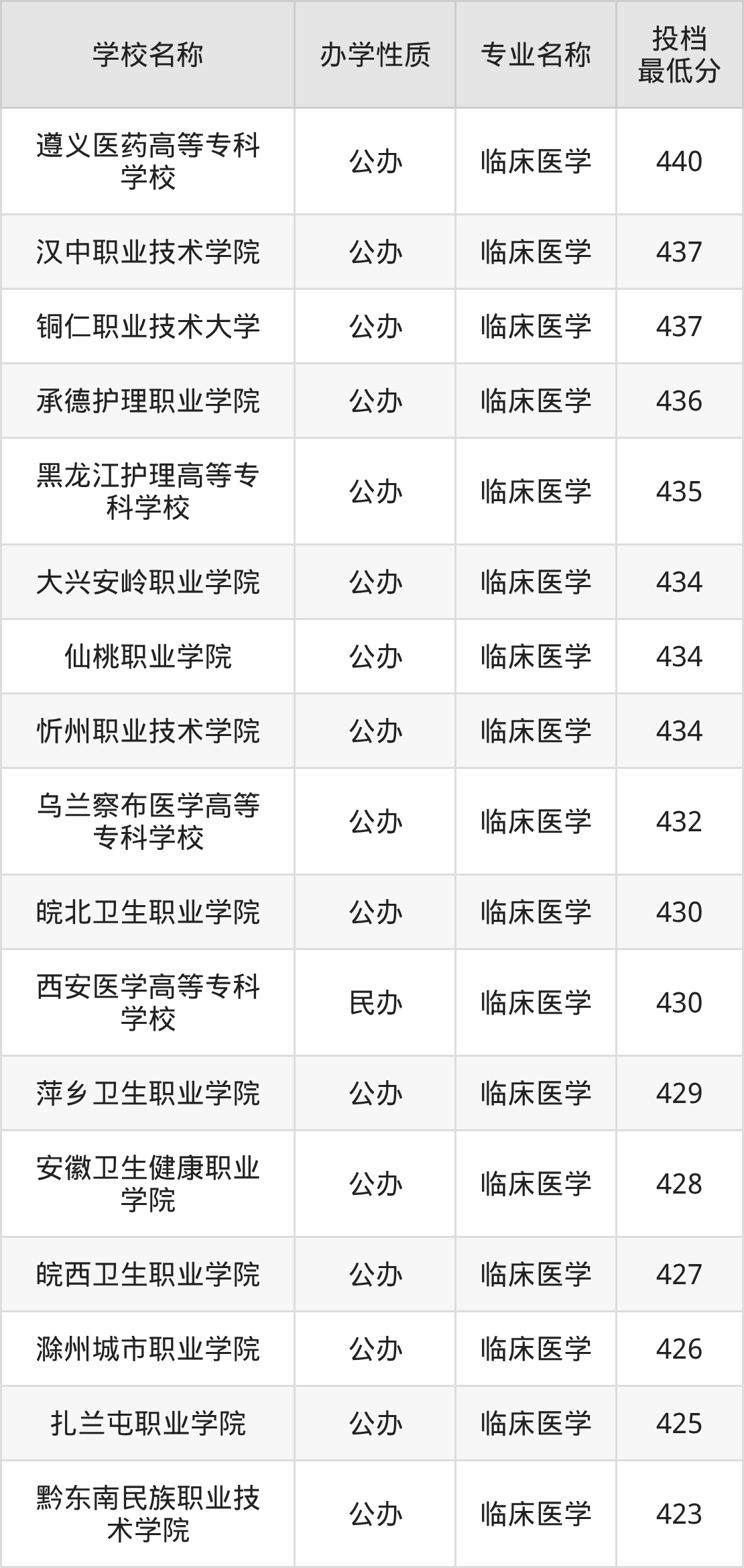临床医学专业收分最低的公办大学是喀什职业技术学院,2025年最低分407分,超专科线207分。可见临床医学专业的招生门槛是非常高的,如果想要上一所公办专科大学的临床医学专业,至少需要过专科线207分及以上。