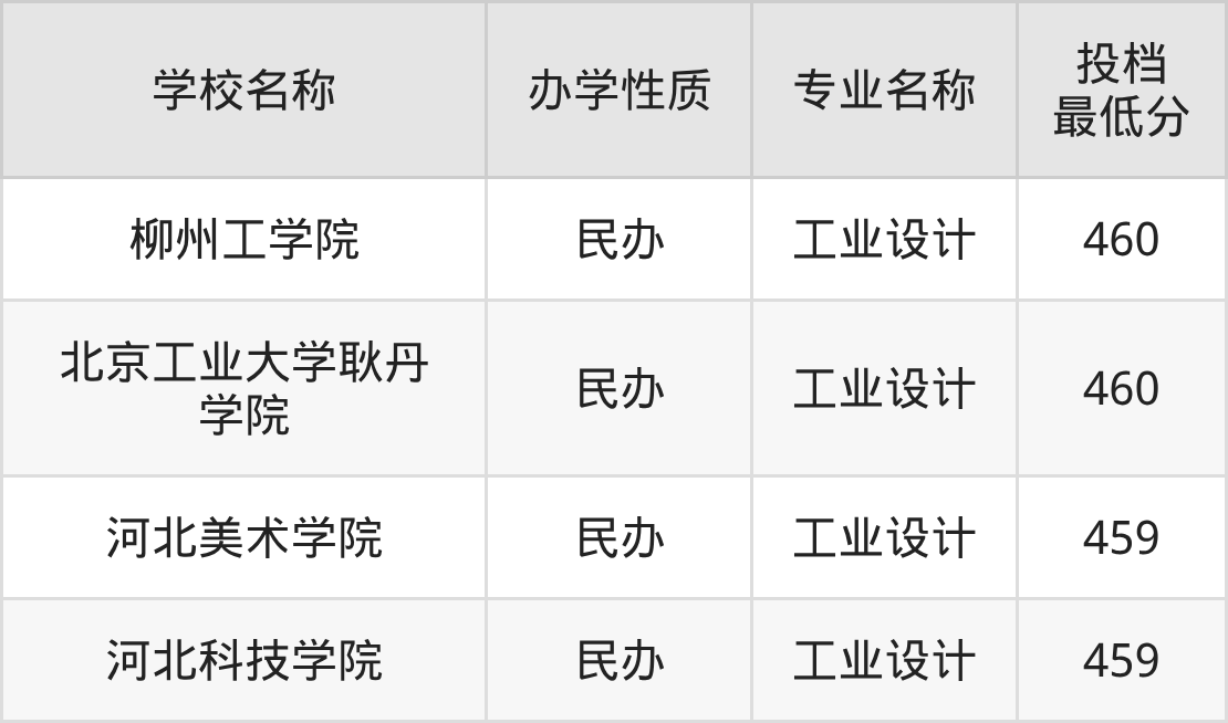 分数线最低、最好考的是河北美术学院,学校工业设计最低分是459,超本科线0分,不过这所学校是民办性质。2025公办大学最低分是504,收分最低的学校是河北石油职业技术大学,超本科线45分能上。