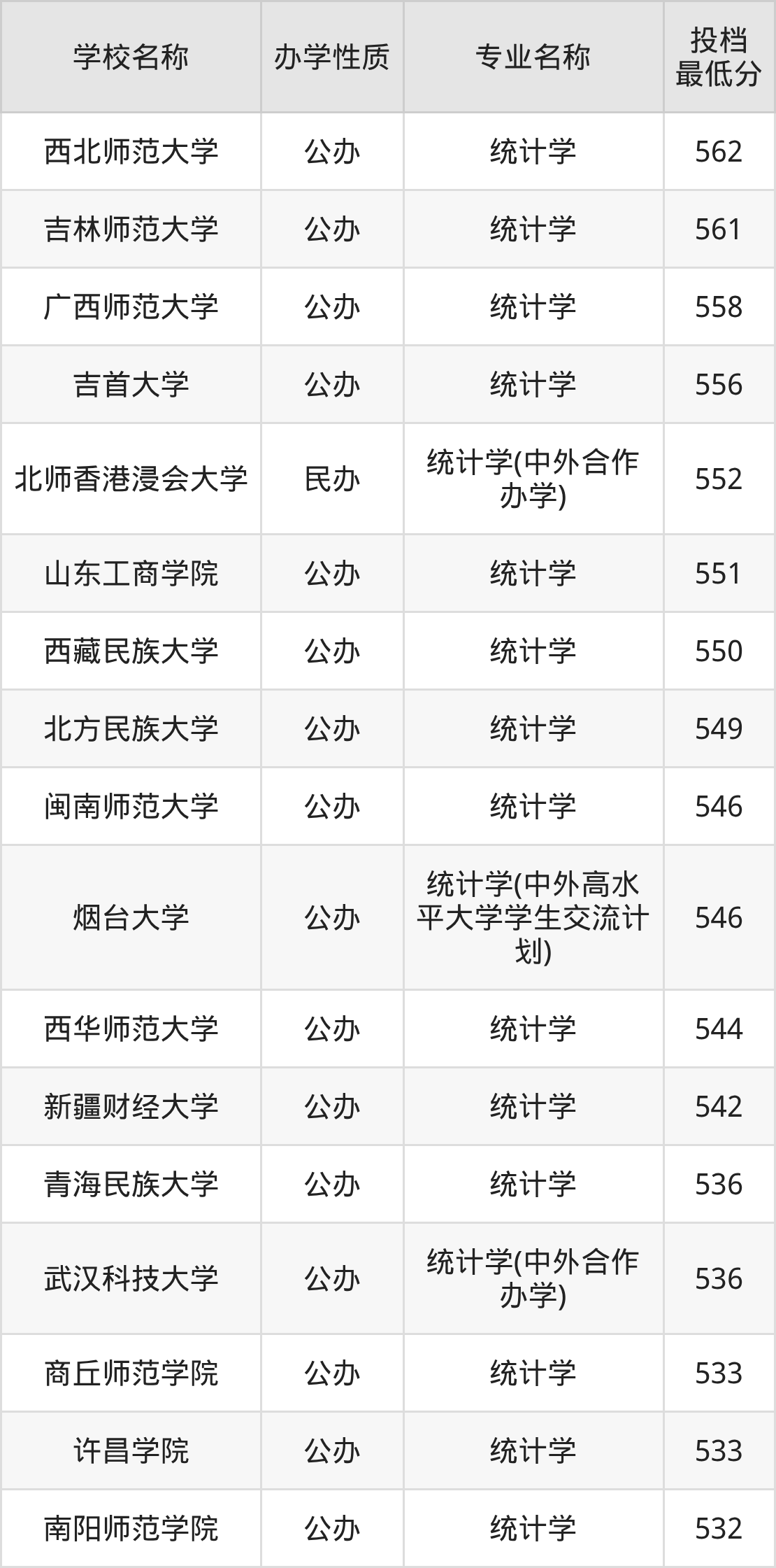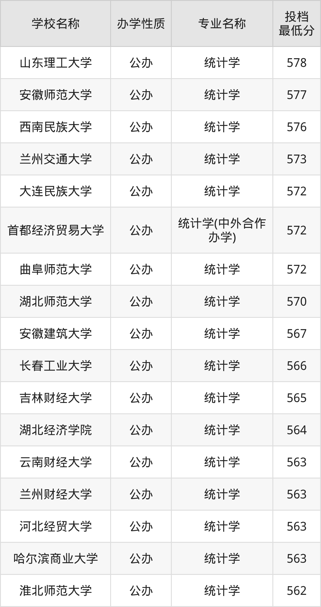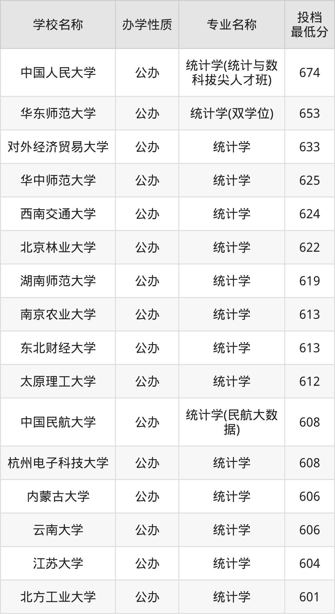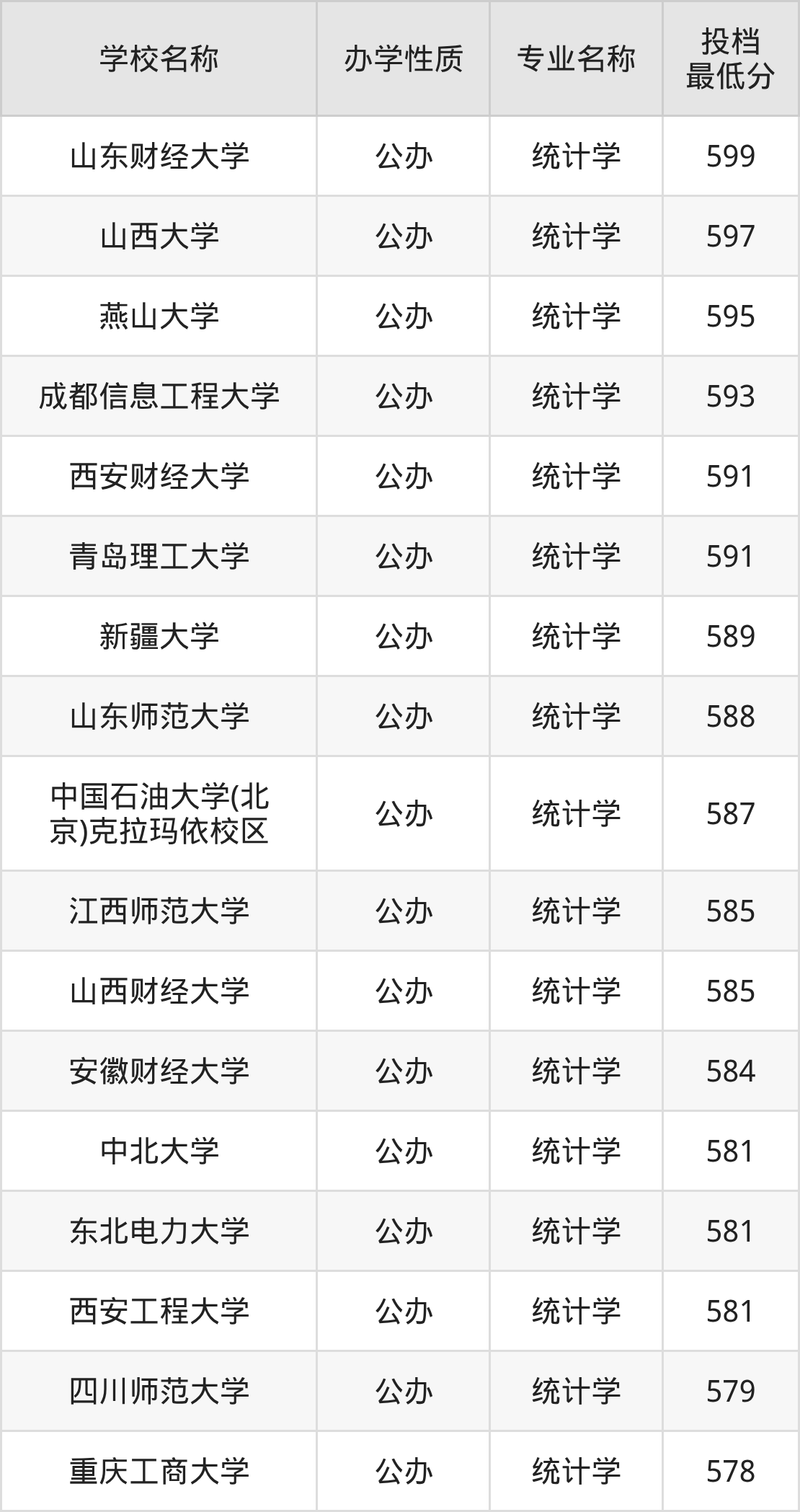 二、全国统计学录取分数线排名表
