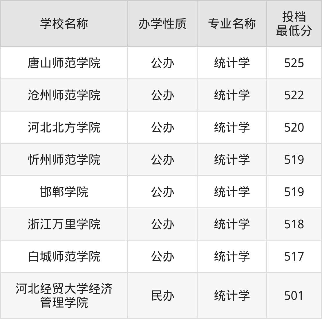 500分左右的统计学大学有:河北北方学院520分、忻州师范学院519分、邯郸学院519分、浙江万里学院518分、白城师范学院517分。