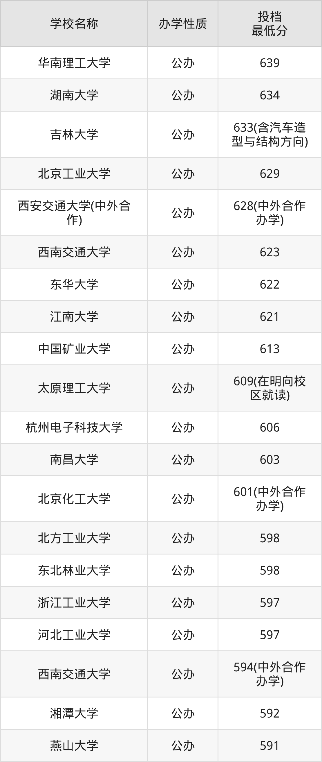 600分左右的工业设计大学:北京化工大学601分(中外合作办学)(中意设计双学位)、南昌大学603分、杭州电子科技大学606分、太原理工大学609分;
