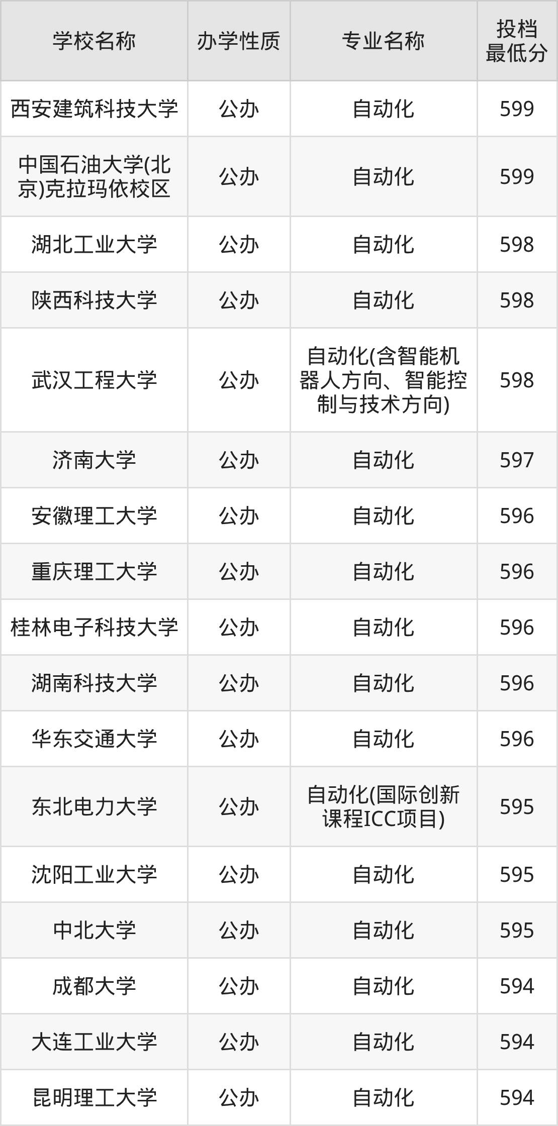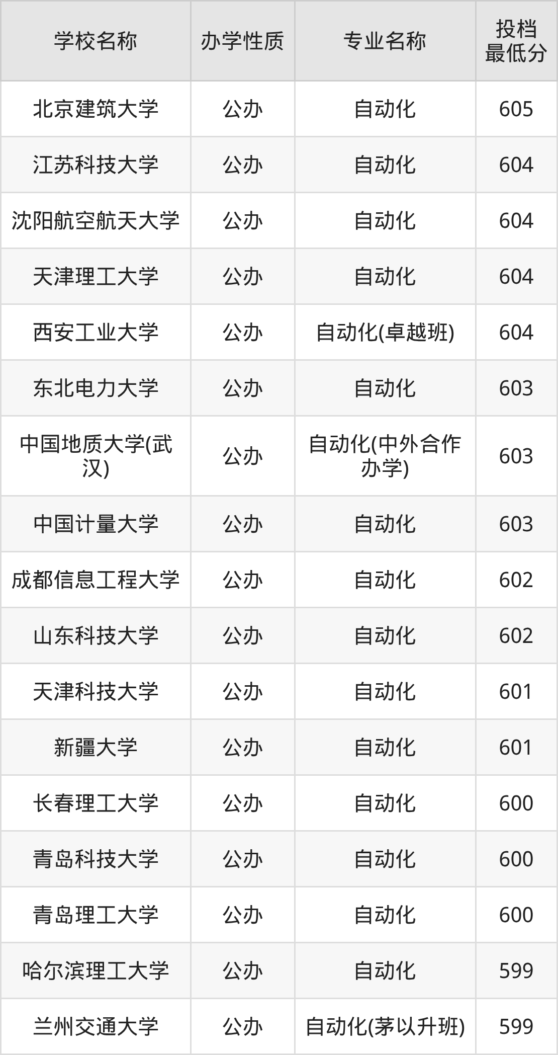 600分左右的自动化大学:新疆大学601分、天津科技大学601分、山东科技大学602分、成都信息工程大学602分、中国计量大学603分等;