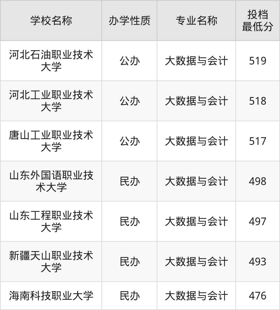 500分左右的大数据与会计大学:唐山工业职业技术大学517分、河北工业职业技术大学518分、河北石油职业技术大学519分等;