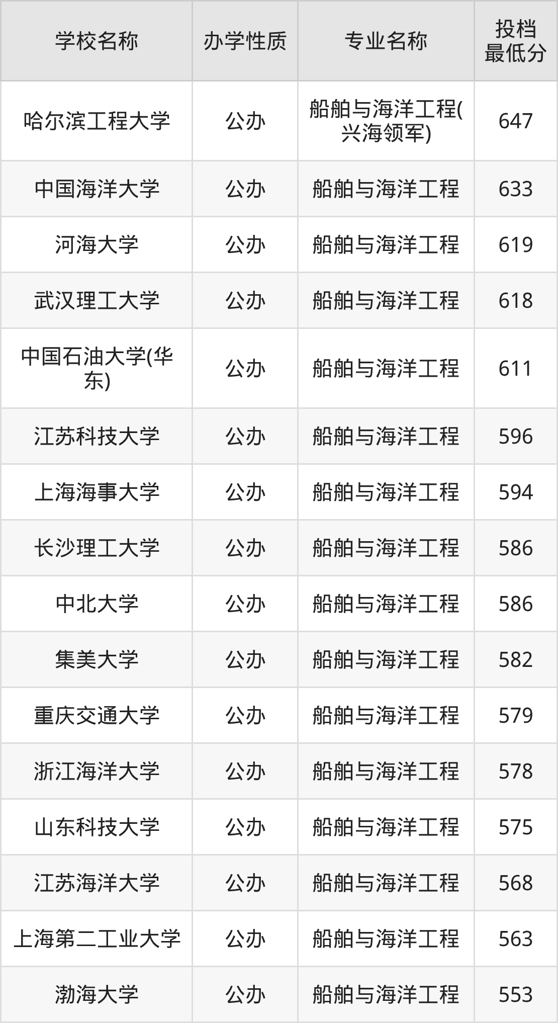 下面是全国各个大学船舶与海洋工程专业最低录取分数线排名一览表,考生可根据自己的分数情况选择合适的学校报考。