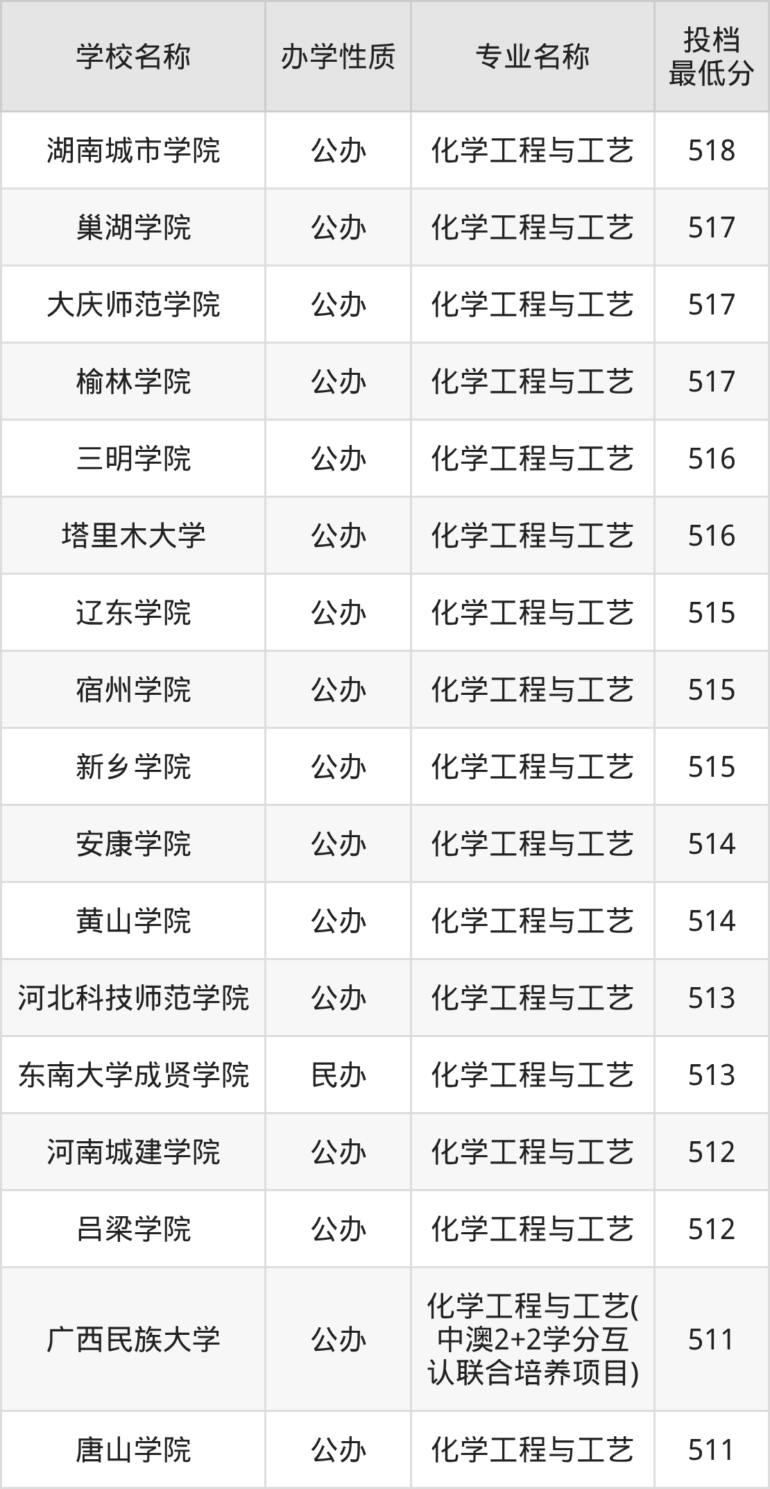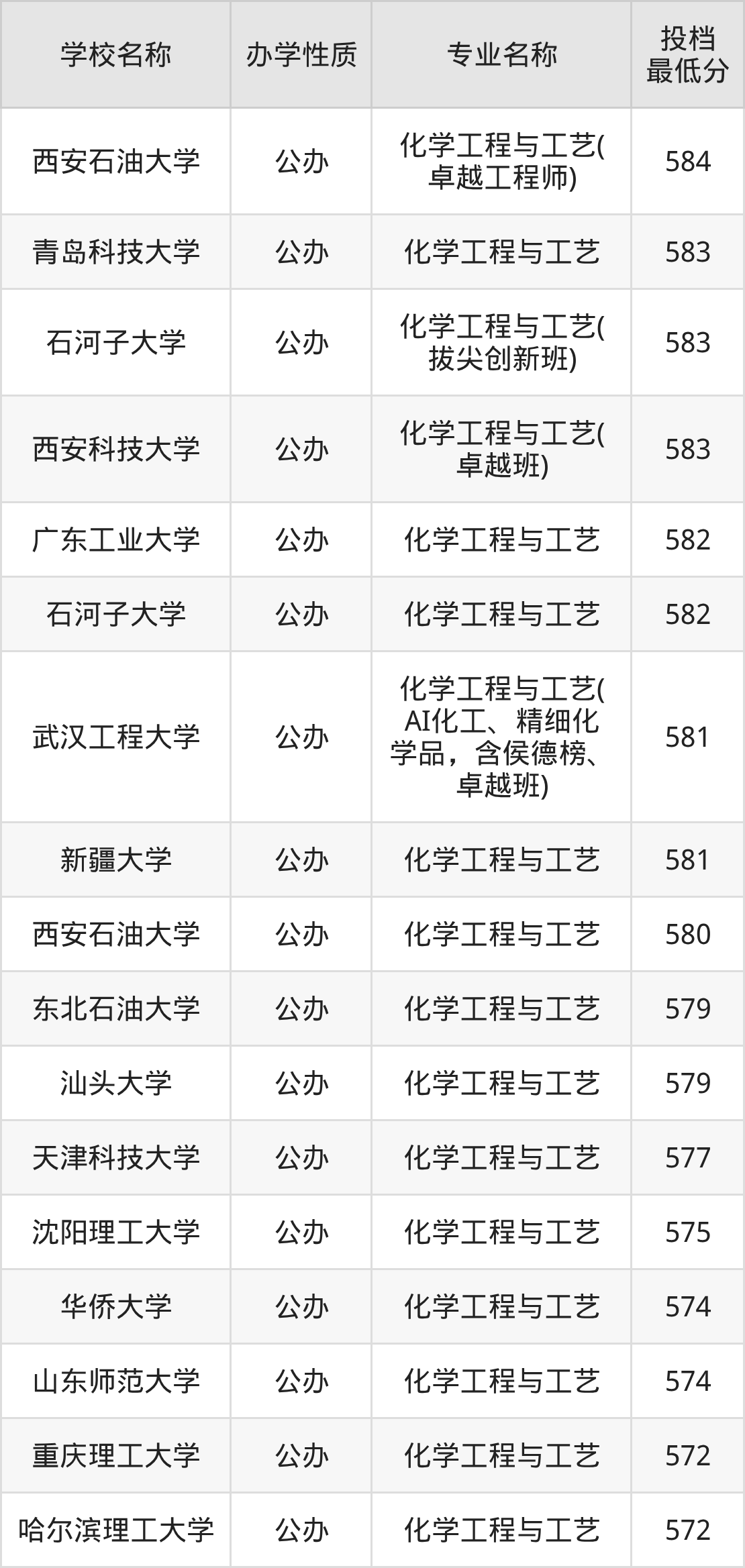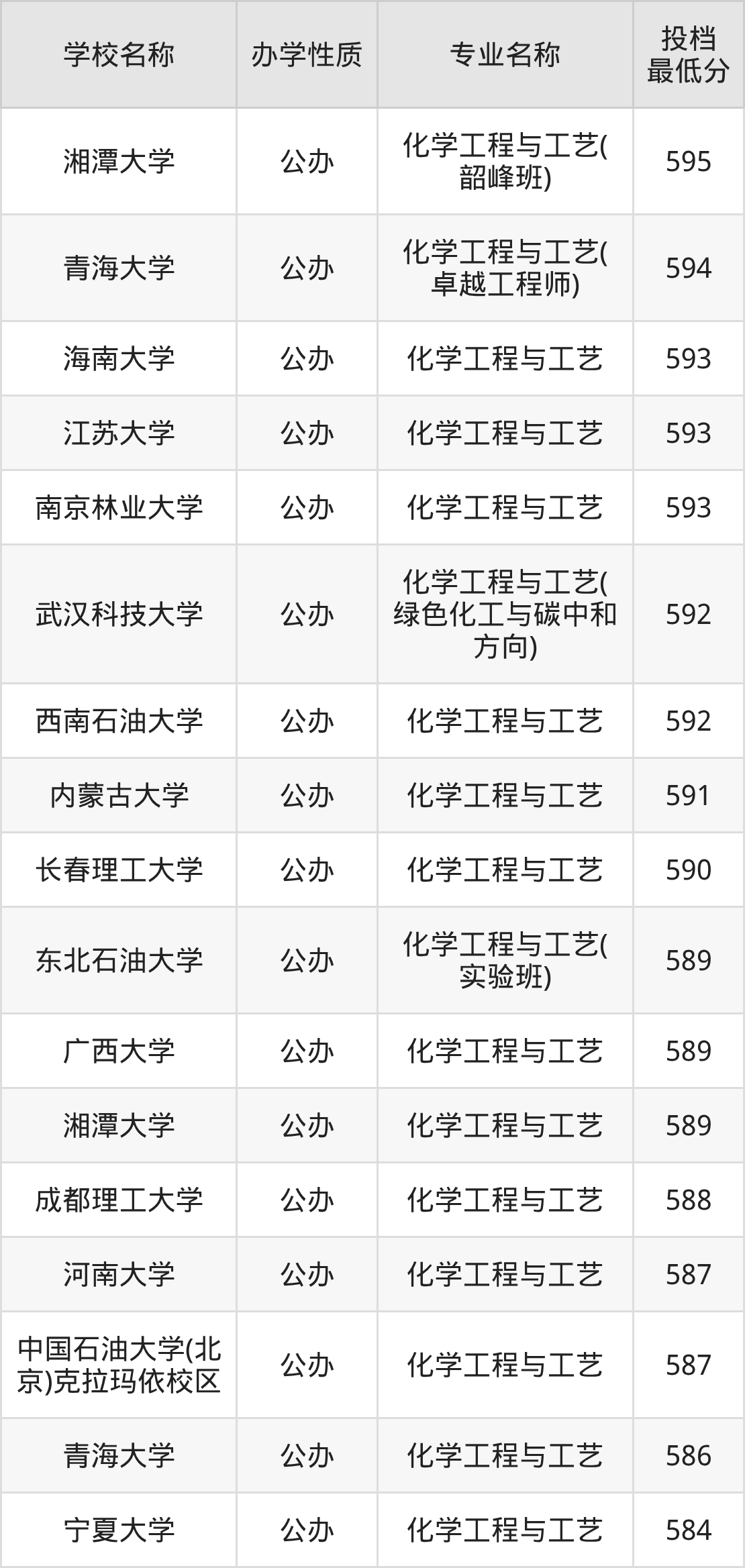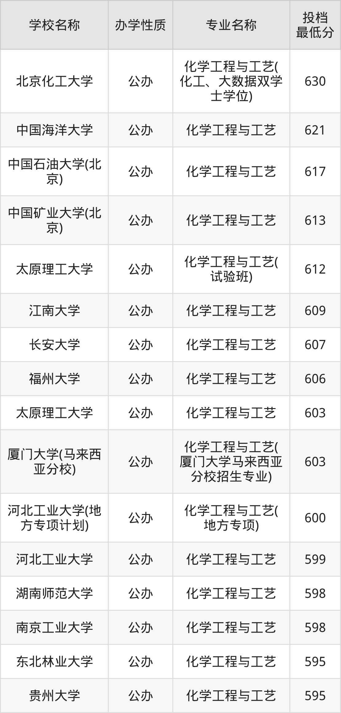 下面是2025年全国所有大学化学工程与工艺专业录取分数线一览表(按照分数线从高到低排名):