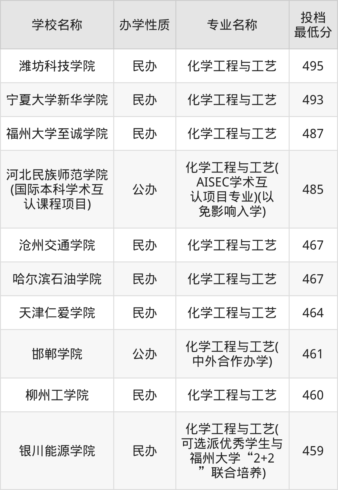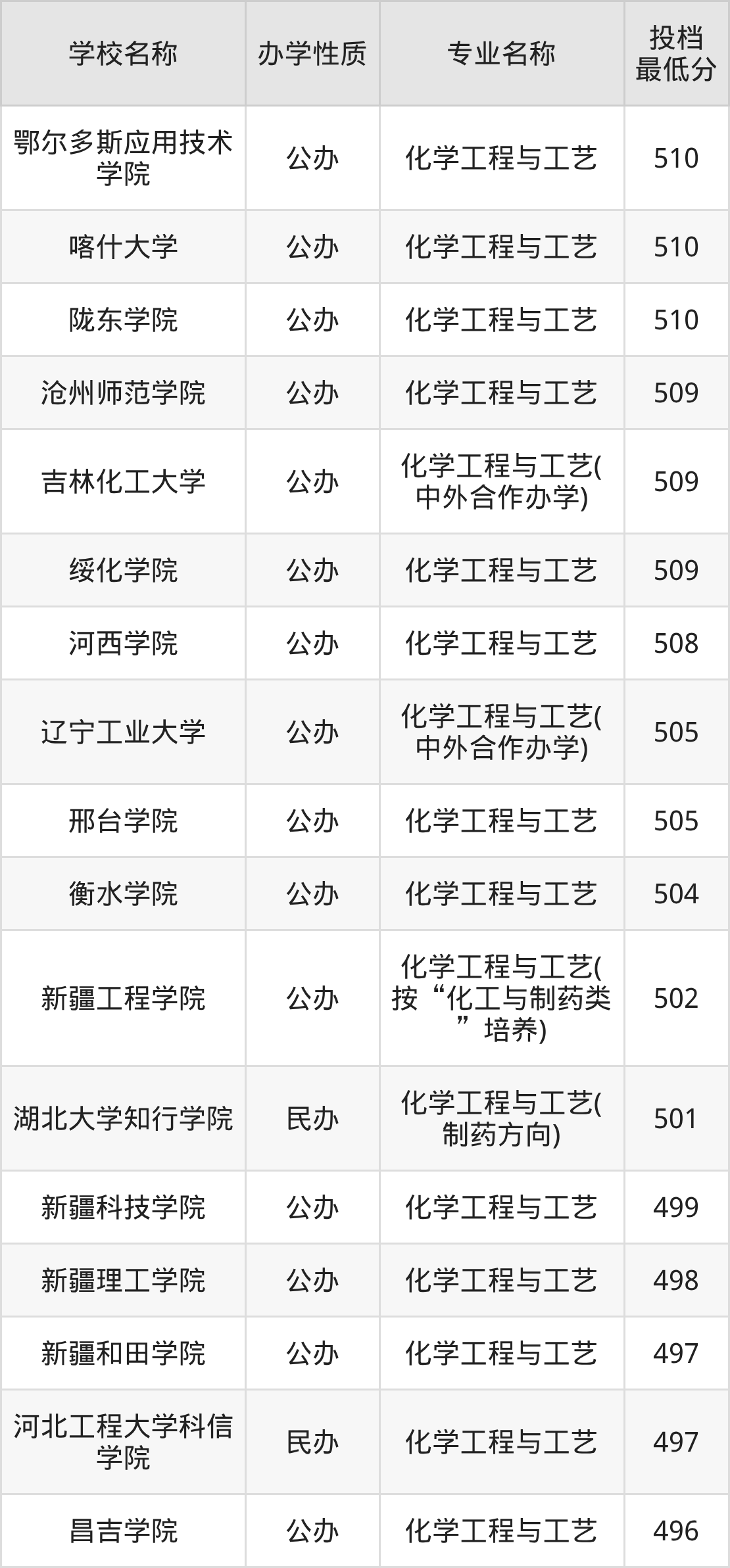 500分左右的化学工程与工艺大学:湖北大学知行学院501分(制药方向)、新疆工程学院502分(按“化工与制药类”培养)、衡水学院504分、邢台学院505分、辽宁工业大学505分(中外合作办学)等;