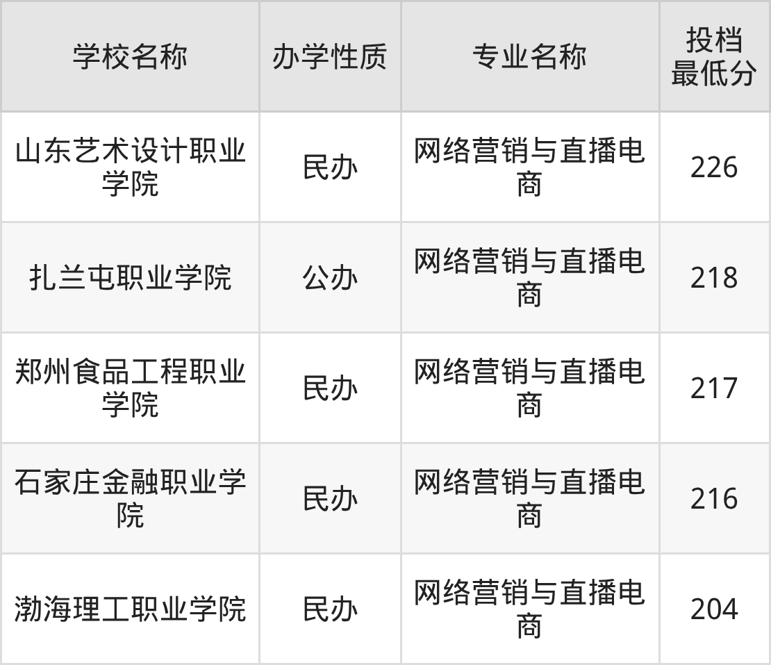 网络营销与直播电商专业收分最低的公办大学是扎兰屯职业学院,2025年最低分218分,超专科线18分。可见网络营销与直播电商专业的招生门槛是非常高的,如果想要上一所公办专科大学的网络营销与直播电商专业,至少需要过专科线18分及以上。