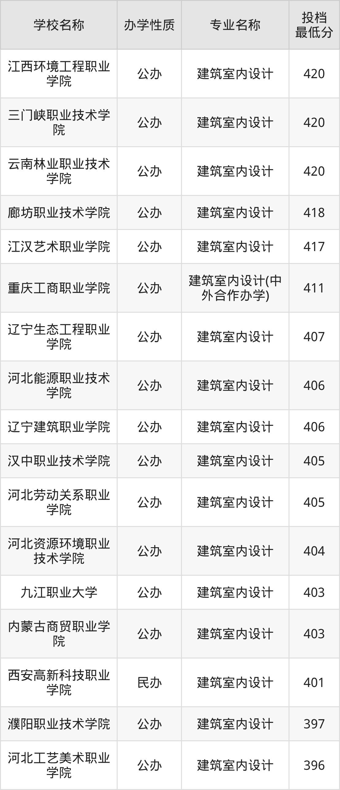2025年建筑室内设计专业最低录取分数线位于200分到476分之间,收分最低的大学是重庆资源与环境保护职业学院。各校最低分如下。