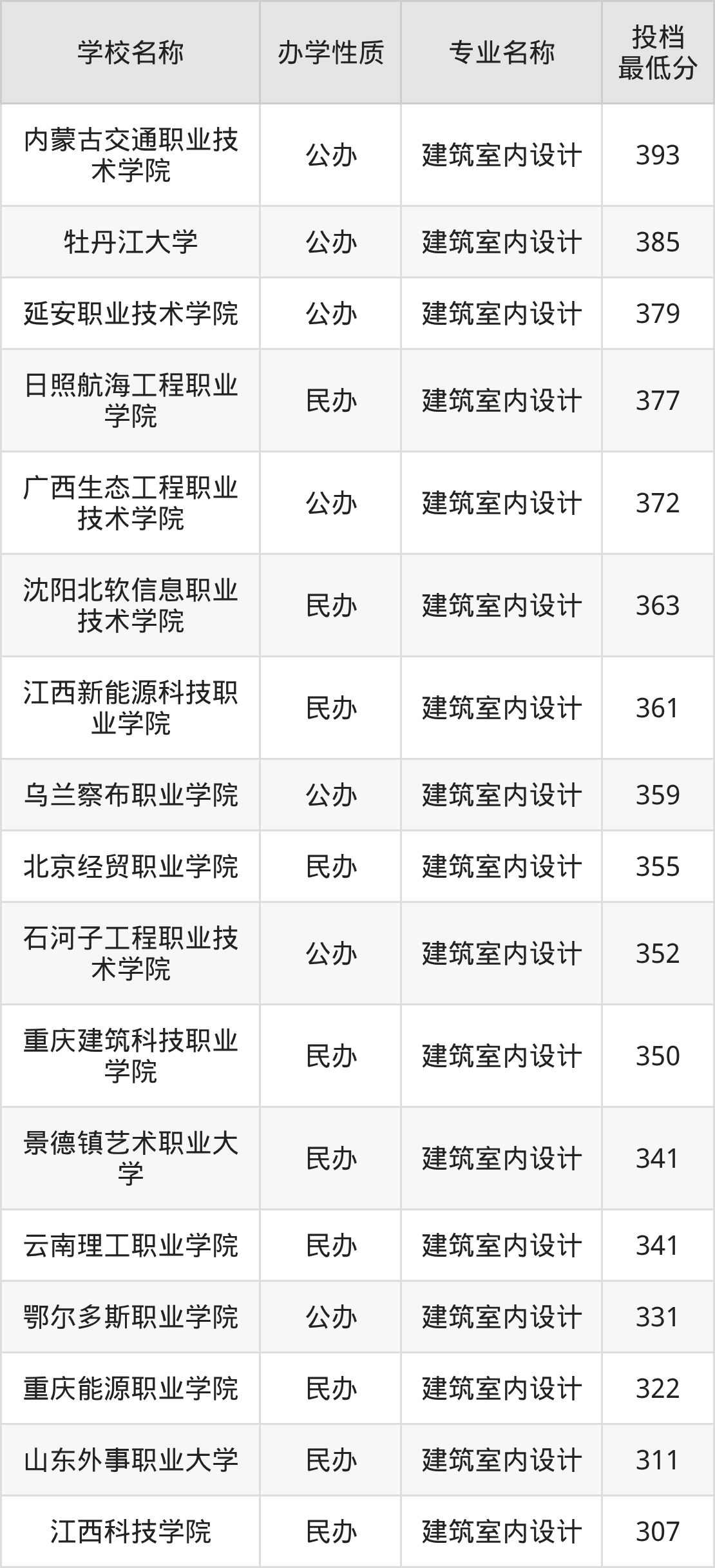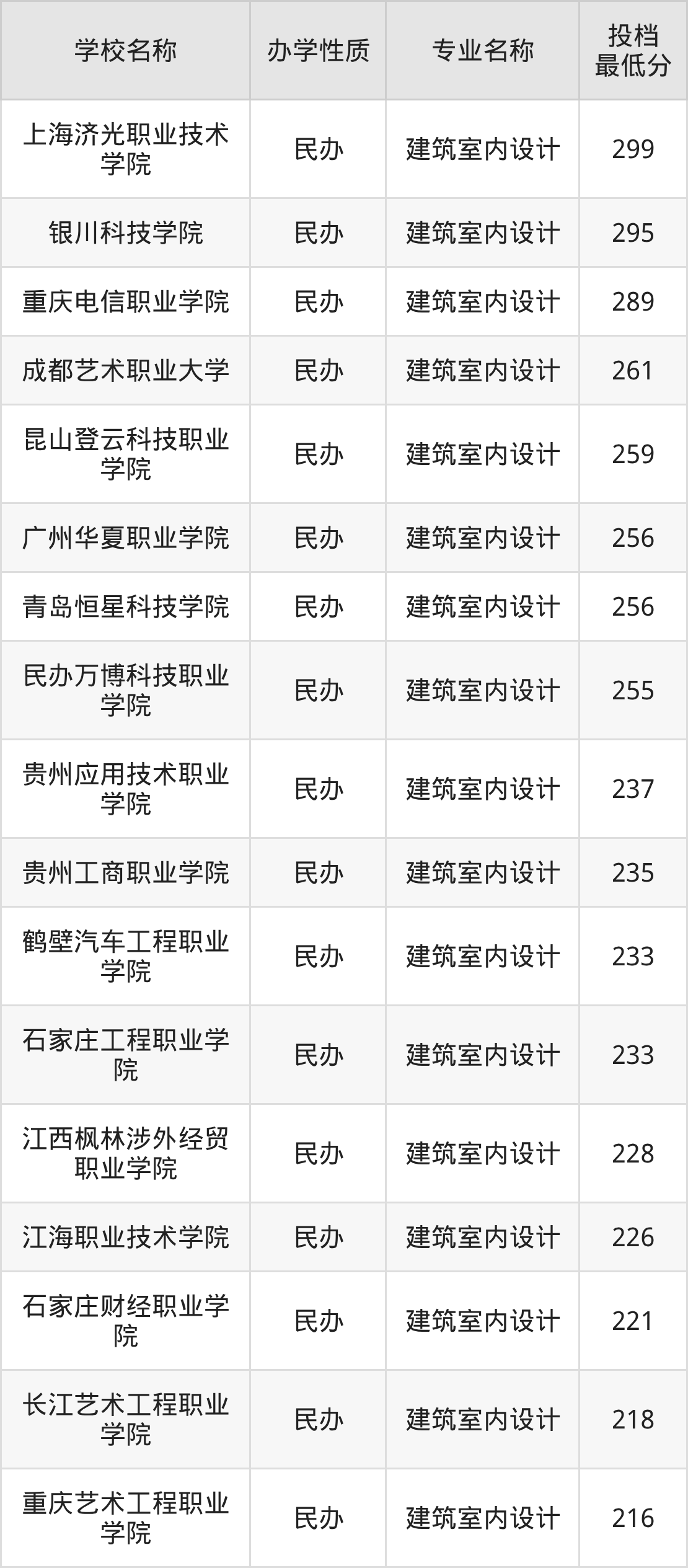 下面是2025年全国所有大学建筑室内设计专业录取分数线一览表(按照分数线从高到低排名):