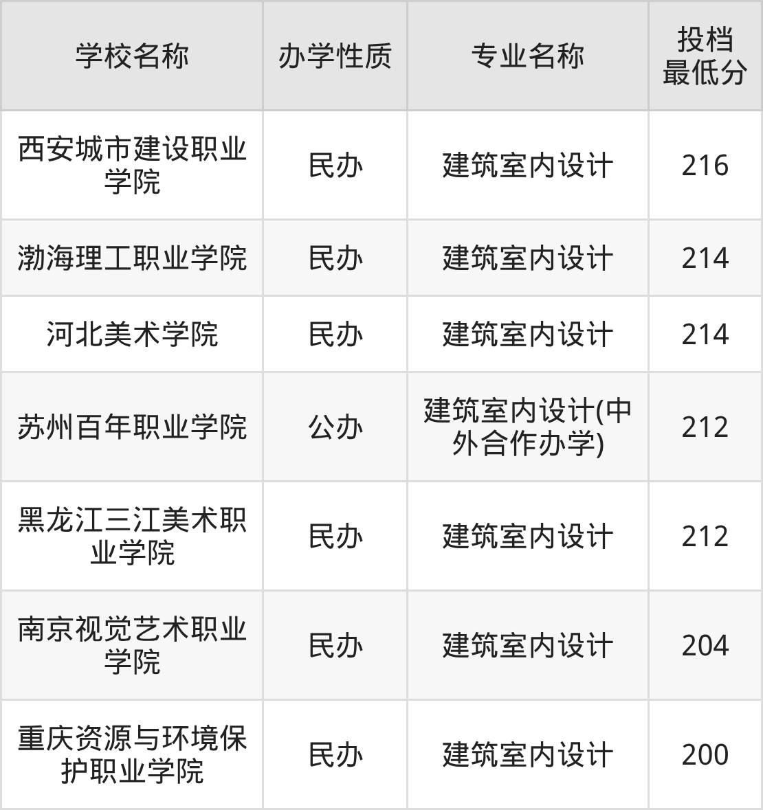 建筑室内设计专业收分最低的公办大学是苏州百年职业学院,2025年最低分212分,超专科线12分。可见建筑室内设计专业的招生门槛是非常高的,如果想要上一所公办专科大学的建筑室内设计专业,至少需要过专科线12分及以上。