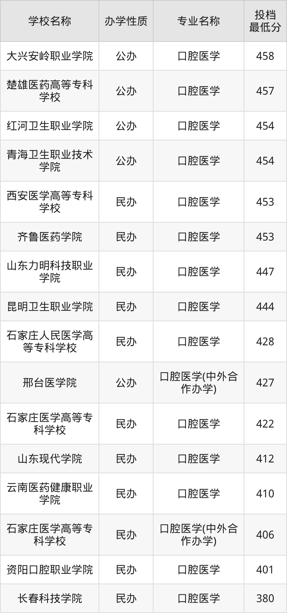 2025年口腔医学专业最低录取分数线位于380分到529分之间,收分最低的大学是长春科技学院。各校最低分如下。