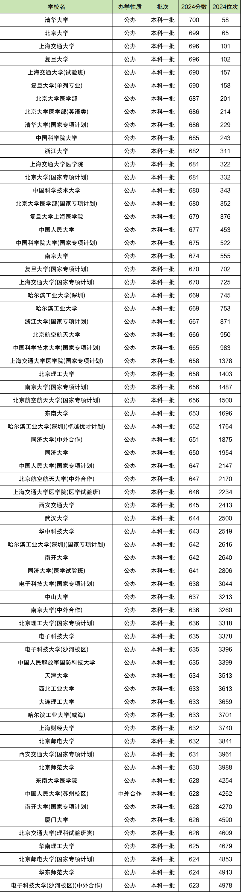 陕西理科1-5000名对应的大学一共有67所,在此范围内,最高位次对应的大学是清华大学,最低录取位次为58位,位次对应分数为700分;